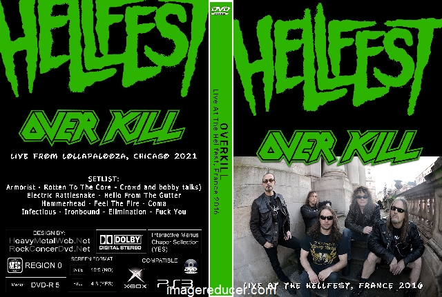 | OVERKILL Live At The Hellfest, France 2016 DVD DVD Format: NTSC Source: Professional Shot (Multi Camera) Video Quality: Rating: 9.0 Menus: No Chapter Selection: Every 5 Min Widescreen: Yes HD: Yes Total Running Time: 60 Min. SETLIST: Armorist Rotten To The Core Crowd and bobby talks) Electric Rattlesnake Hello From The Gutter Hammerhead Feel The Fire Coma Infectious Ironbound Elimination Fuck You |