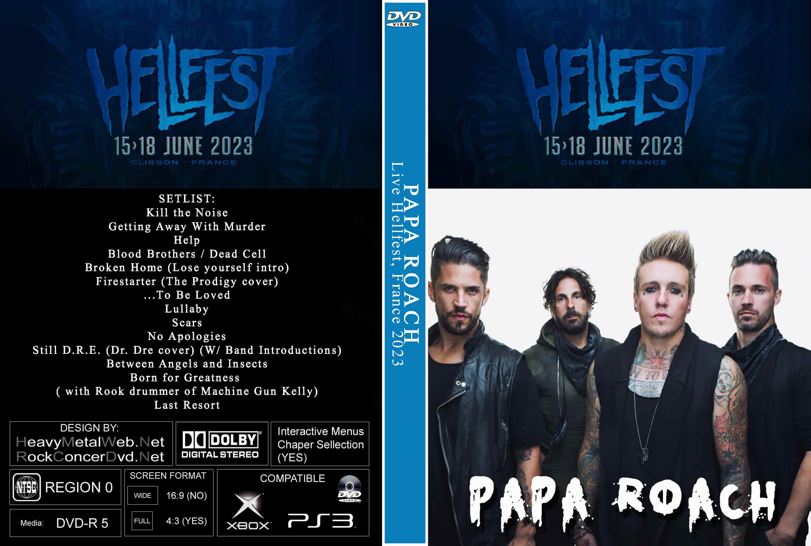 | PAPA ROACH Live At The Hellfest, France 2023 DVD DVD Format: NTSC Source: Professional Shot (Multi- Camera) Video Quality: Rating: 9.0 Menus: No Chapter Selection: Skip Avery 5 Min WideScreen: Yes HD: Yes Total Running Time: 61 Min. SETLIST: Kill the Noise Getting Away With Murder Help Blood Brothers / Dead Cell Broken Home (Lose yourself intro) Firestarter (The Prodigy cover) ...To Be Loved Lullaby Scars No Apologies Still D.R.E. (Dr. Dre cover) (W/ Band Introductions) Between Angels and Insects Born for Greatness ( with Rook drummer of Machine Gun Kelly) Last Resort |