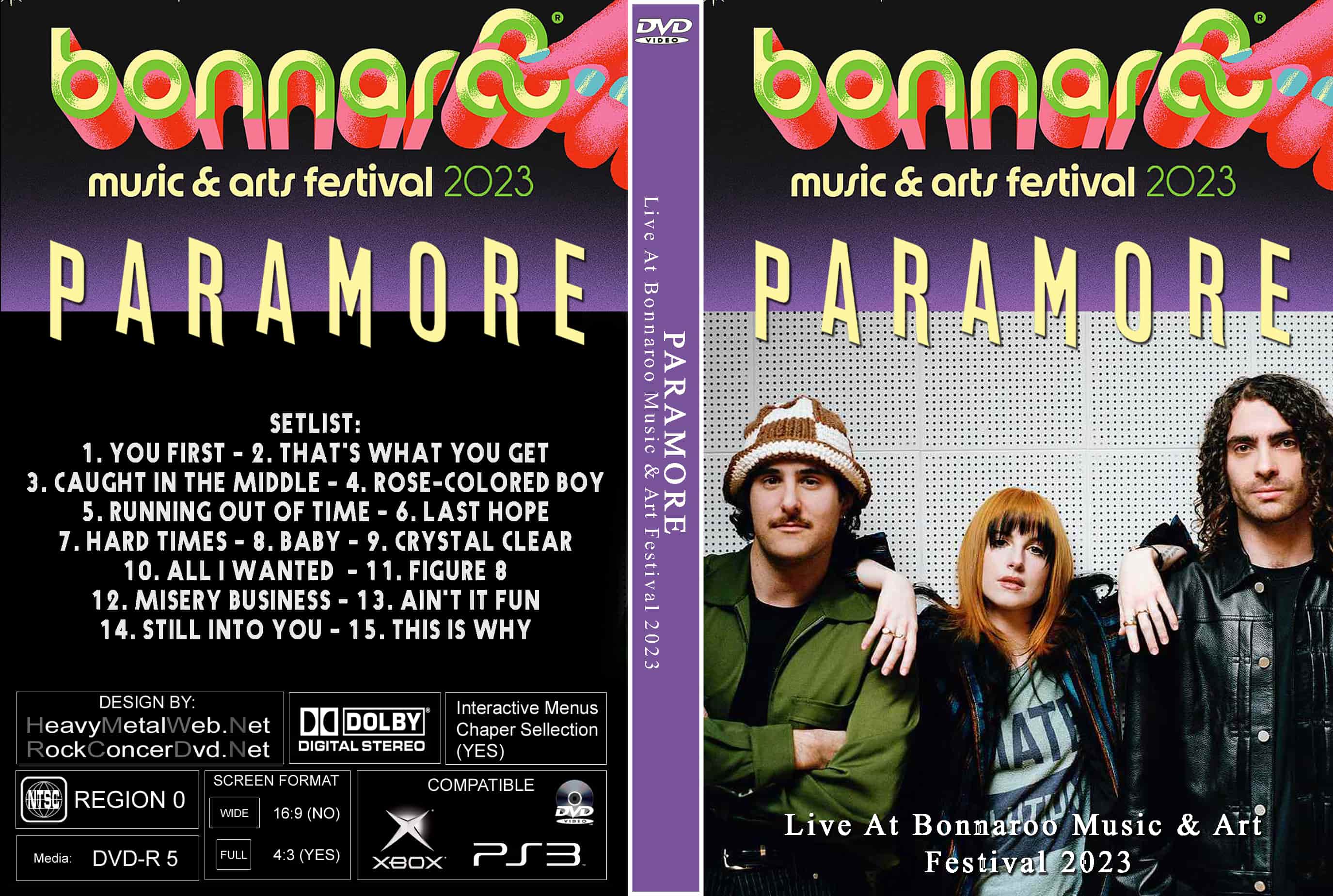 | PARAMORE Live At Bonnaroo Festival 2023 DVD DVD Format: NTSC Source: Professional Shot (Multi- Camera) Video Quality: Rating: 9.0 Menus: No Chapter Selection: Skip Avery 5 Min WideScreen: Yes HD: Yes Total Running Time: 71 Min. SETLIST: 1. You First 2. That's What You Get 3. Caught in the Middle 4. Rose-Colored Boy 5. Running Out of Time 6. Last Hope 7. Hard Times 8. Baby 9. Crystal Clear 10. All I Wanted 11. Figure 8 12. Misery Business 13. Ain't It Fun 14. Still Into You 15. This Is Why |