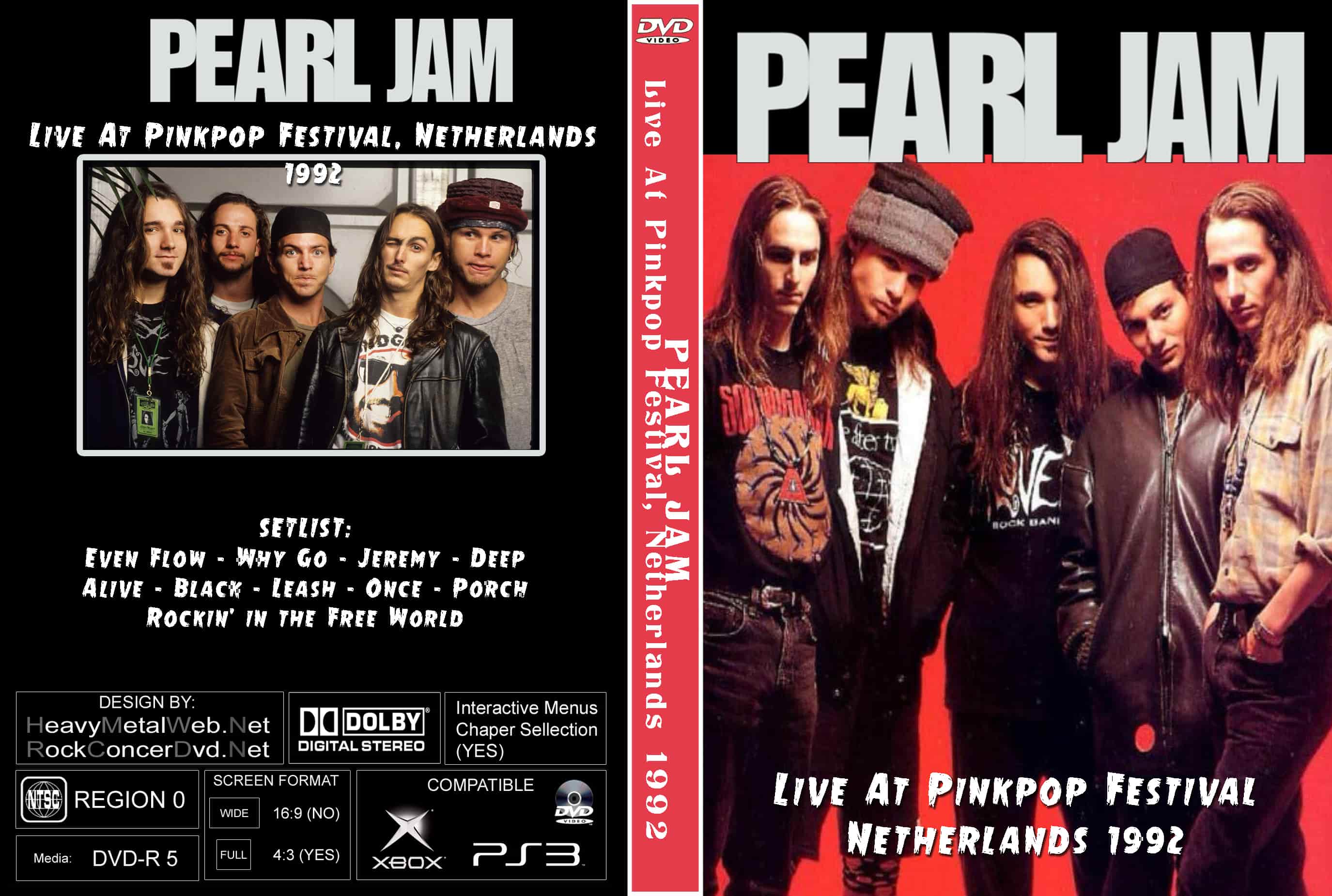 | PEARL JAM Live At Pinkpop Festival, Netherlands 1992 DVD DVD Format: NTSC Source: Professional Shot (Multi-Camera) Video Quality: Rating: 8.5 Menus: Yes Chapter Selection: Every 5 Min. WideScreen: No HD: No Total Running Time: 52 Min. SETLIST: Even Flow Why Go Jeremy Deep Alive Black Leash Once Porch Rockin’ in the Free World |
