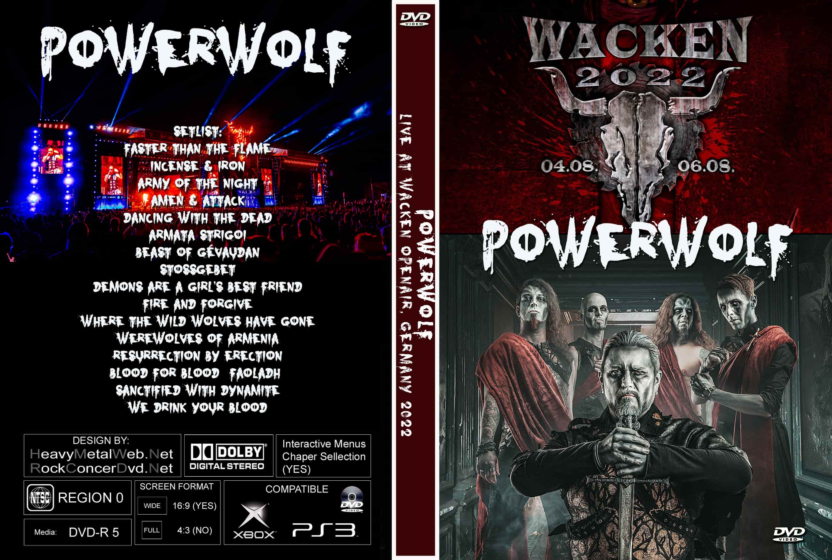| POWERWOLF Live Wacken Open Air, Germany 2022 DVD DVD Format: NTSC Source: Professional Shot (Multi Camera) Video Quality: Rating: 9.0 Menus: No Chapter Selection: Every 5 Min Widescreen: Yes HD: Yes Total Running Time: 88 Min. SETLIST: Faster Than the Flame Incense & Iron Army of the Night Amen & Attack Dancing With the Dead Armata Strigoi Beast of Gévaudan Stossgebet Demons Are a Girl's Best Friend Fire and Forgive Where the Wild Wolves Have Gone Werewolves of Armenia Resurrection by Erection Blood for Blood (Faoladh) Sanctified With Dynamite We Drink Your Blood |