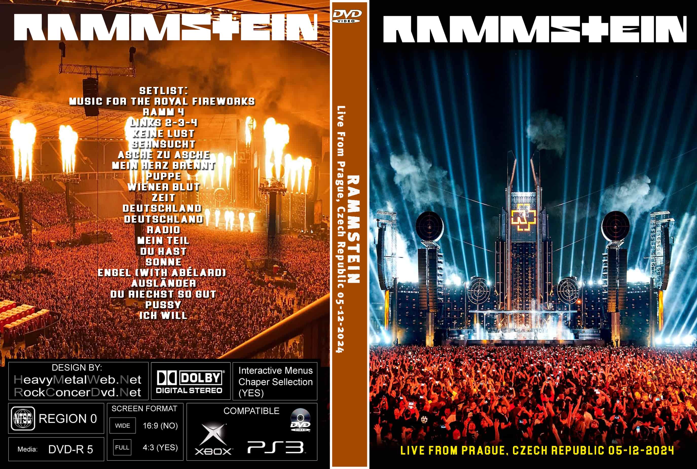 | RAMMSTEIN Live From Prague, Czech Republic 05-12-2024 (2 DVDs) DVD Format: NTSC Source: Audience Shot (Single- Camera) Video Quality: Rating: 9.0 Menus: Yes Chapter Selection: Every 5 Min. WideScreen: Yes HD: Yes Total Running Time: 115 Min. SETLIST: Music for the Royal Fireworks (George Frideric Handel song) Ramm 4 Links 2-3-4 Keine Lust Sehnsucht Asche zu Asche Mein Herz brennt Puppe Wiener Blut Zeit Deutschland (Remix by Richard Z. Kruspe) Deutschland Radio Mein Teil Du hast Sonne Engel (with ABÉLARD) (Piano-version; performed on B-Stage) Ausländer Du riechst so gut Pussy Ich will |