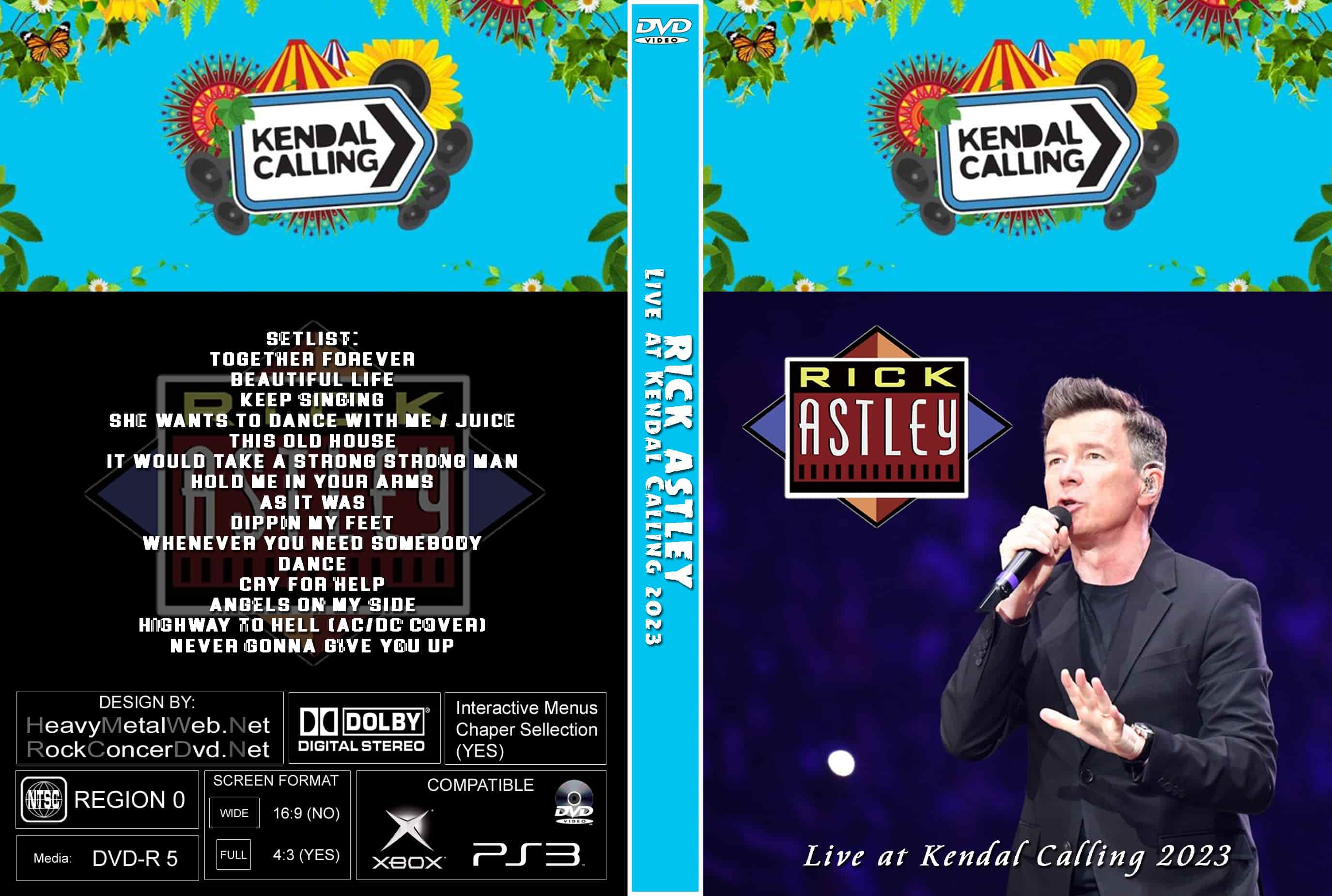 | RICK ASTLEY Live at Kendal Calling 2023 DVD DVD Format: NTSC Source: Professional Shot (Multi- Camera) Video Quality: Rating: 9.0 Menus: Yes Chapter Selection: Every 5 Min. WideScreen: Yes HD: Yes Total Running Time: 62 Min. SETLIST: Together Forever Beautiful Life Keep Singing She Wants to Dance With Me / Juice This Old House It Would Take a Strong Strong Man Hold Me in Your Arms As It Was Dippin My Feet Whenever You Need Somebody Dance Cry for Help Angels on My Side Highway to Hell (AC/DC cover) Never Gonna Give You Up |