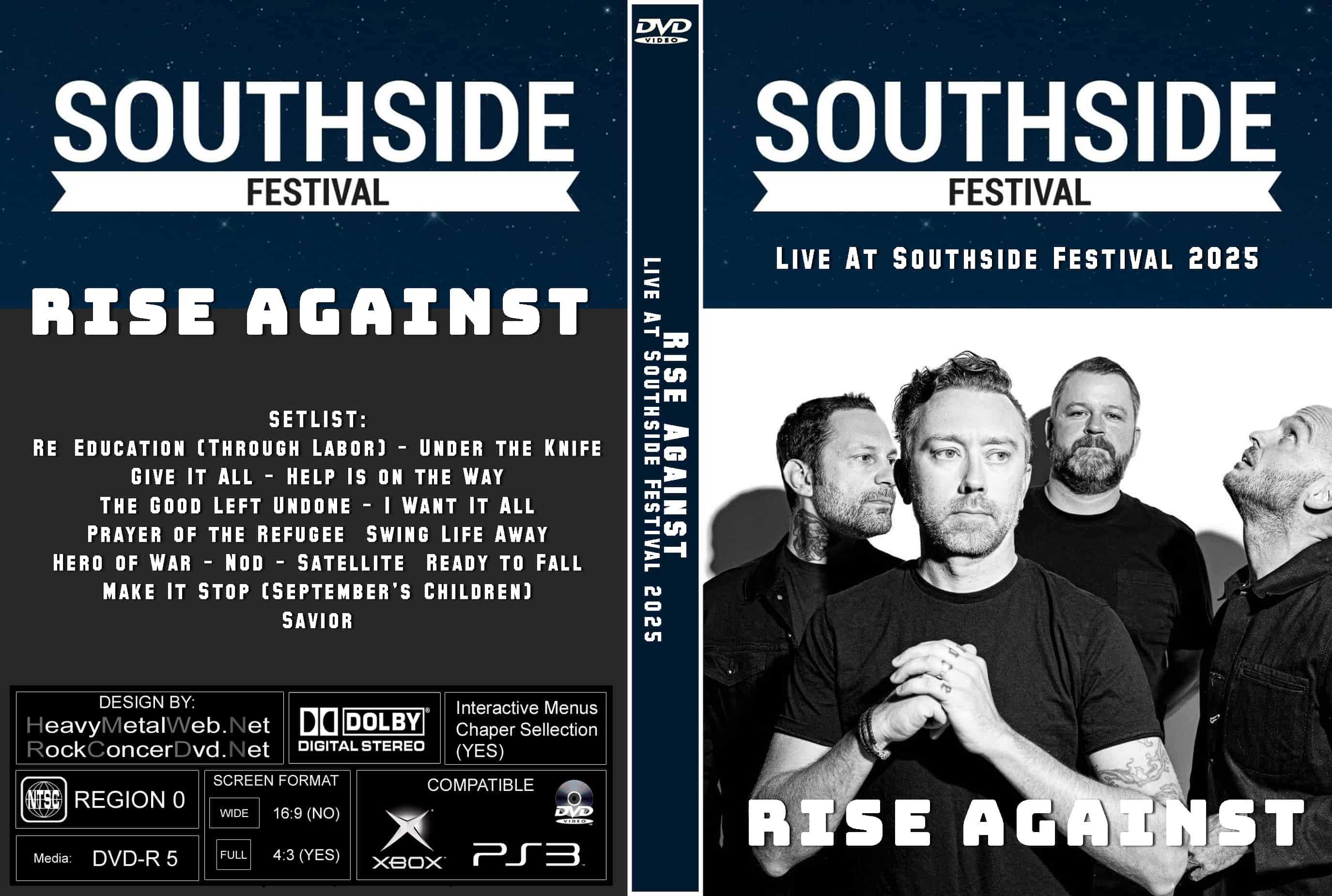 | RISE AGAINST Live At Southside Festival, Germany 06-21-2025 DVD DVD Format: NTSC Source: Professional Shot (Multi‑Camera) Video Quality: Rating: 9.0, HD, Widescreen Menus: No Chapter Selection: Every 5 Min. Total Running Time: 80 Min SETLIST: Re-Education (Through Labor) Under the Knife Give It All Help Is on the Way The Good Left Undone I Want It All Prayer of the Refugee Swing Life Away Hero of War Nod Satellite Ready to Fall Bricks Make It Stop (September's Children) Savior |