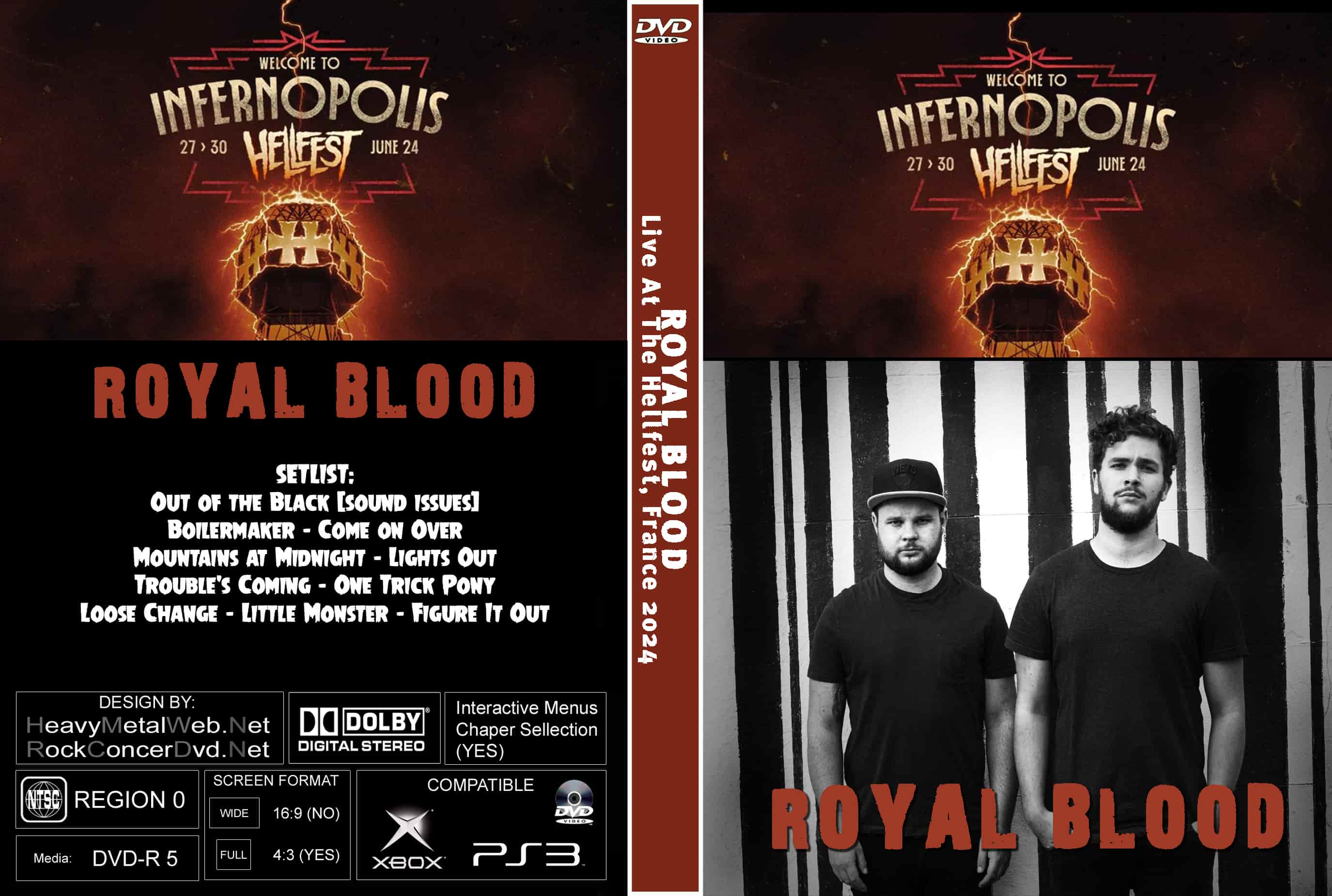 | ROYAL BLOOD Live At The Hellfest, France 2024 DVD DVD Format: NTSC Source: Professional Shot (Multi- Camera) Video Quality: Rating: 9.0 Menus: Yes Chapter Selection: Every 5 Min. WideScreen: Yes HD: Yes Total Running Time: 43 Min. SETLIST: Out of the Black (sound issues) Boilermaker Come on Over Mountains at Midnight Lights Out Trouble's Coming One Trick Pony Loose Change Little Monster Figure It Out |