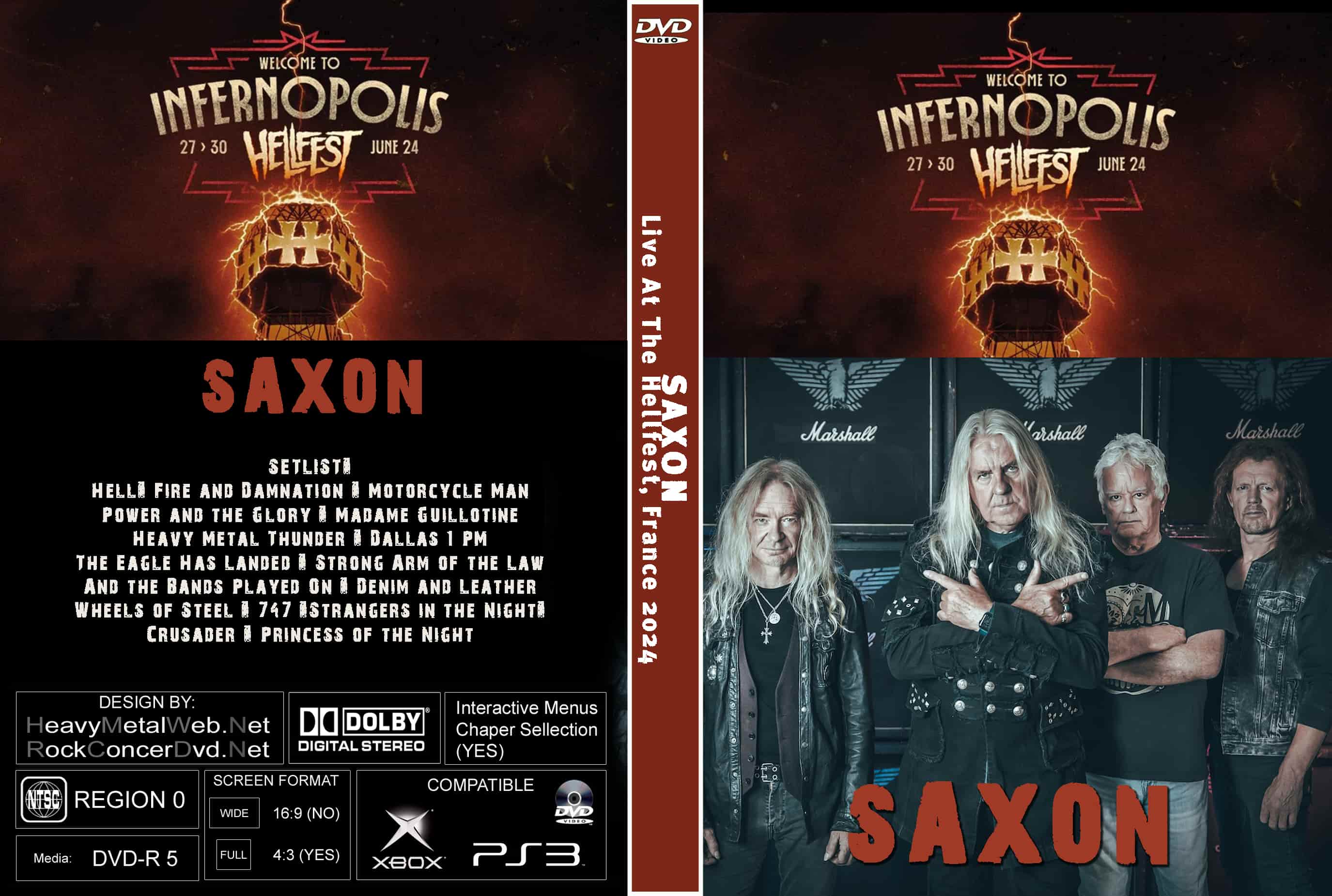 | SAXON Live At The Hellfest, France 2024 DVD DVD Format: NTSC Source: Professional Shot (Multi- Camera) Video Quality: Rating: 9.0 Menus: Yes Chapter Selection: Every 5 Min. WideScreen: Yes HD: Yes Total Running Time: 73 Min. SETLIST: Hell, Fire and Damnation Motorcycle Man Power and the Glory Madame Guillotine Heavy Metal Thunder Dallas 1 PM The Eagle Has Landed Strong Arm of the Law And the Bands Played On Denim and Leather Wheels of Steel 747 (Strangers in the Night) Crusader Princess of the Night |