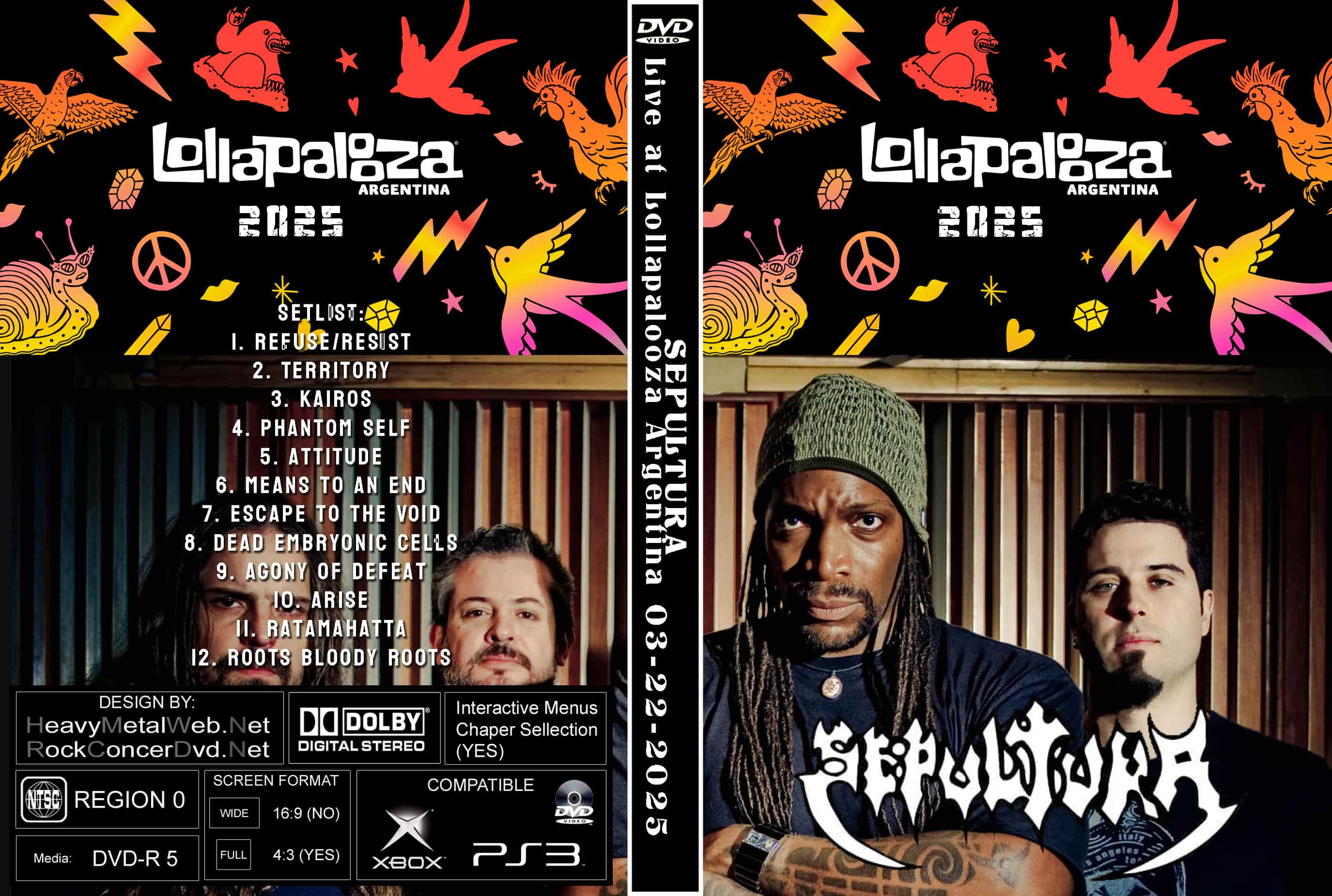 | SEPULTURA Live at Lollapalooza Argentina, Buenos Aires, Argentina 03-22-2025 DVD DVD Format: NTSC Source: Professional Shot (Multi-Camera) Video Quality: 9.0 Menus: No Chapter Selection: Every 5 Min. WideScreen: Yes HD: Yes Total Running Time: 57 Min. SETLIST: 1. Refuse/Resist 2. Territory 3. Kairos 4. Phantom Self 5. Attitude 6. Means to an End 7. Escape to the Void 8. Dead Embryonic Cells 9. Agony of Defeat 10. Arise 11. Ratamahatta 12. Roots Bloody Roots |