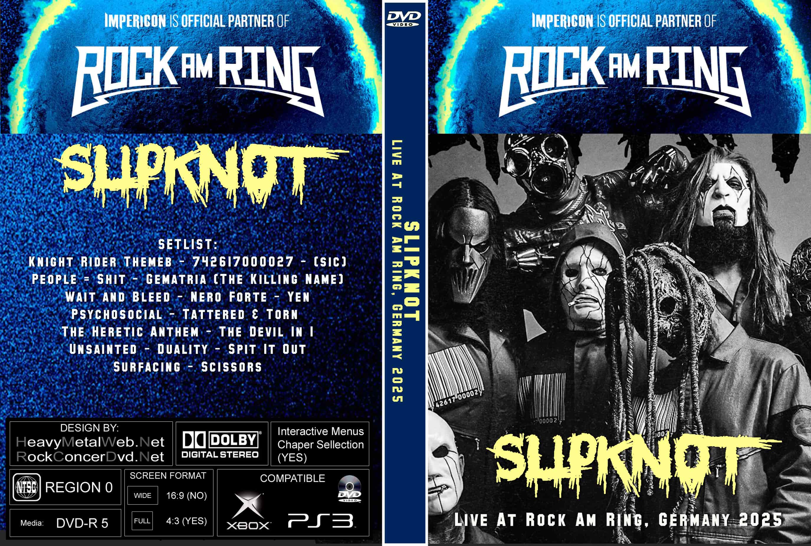 | SLIPKNOT Live At Rock Am Ring, Germany 06-07-2025 DVD DVD Format: NTSC Source: Professional Shot (Festival Broadcast / Multi‑Camera) Video Quality: Rating: 9.0, HD, Widescreen Menus: No Chapter Selection: Every 5 Min. Total Running Time: 79 Min SETLIST: Knight Rider Theme (tape) 742617000027 (tape) (sic) People = Shit Gematria (The Killing Name) Wait and Bleed Nero Forte Yen Psychosocial Tattered & Torn (Sid Remix) The Heretic Anthem The Devil In I Unsainted Duality Spit It Out Surfacing Scissors |