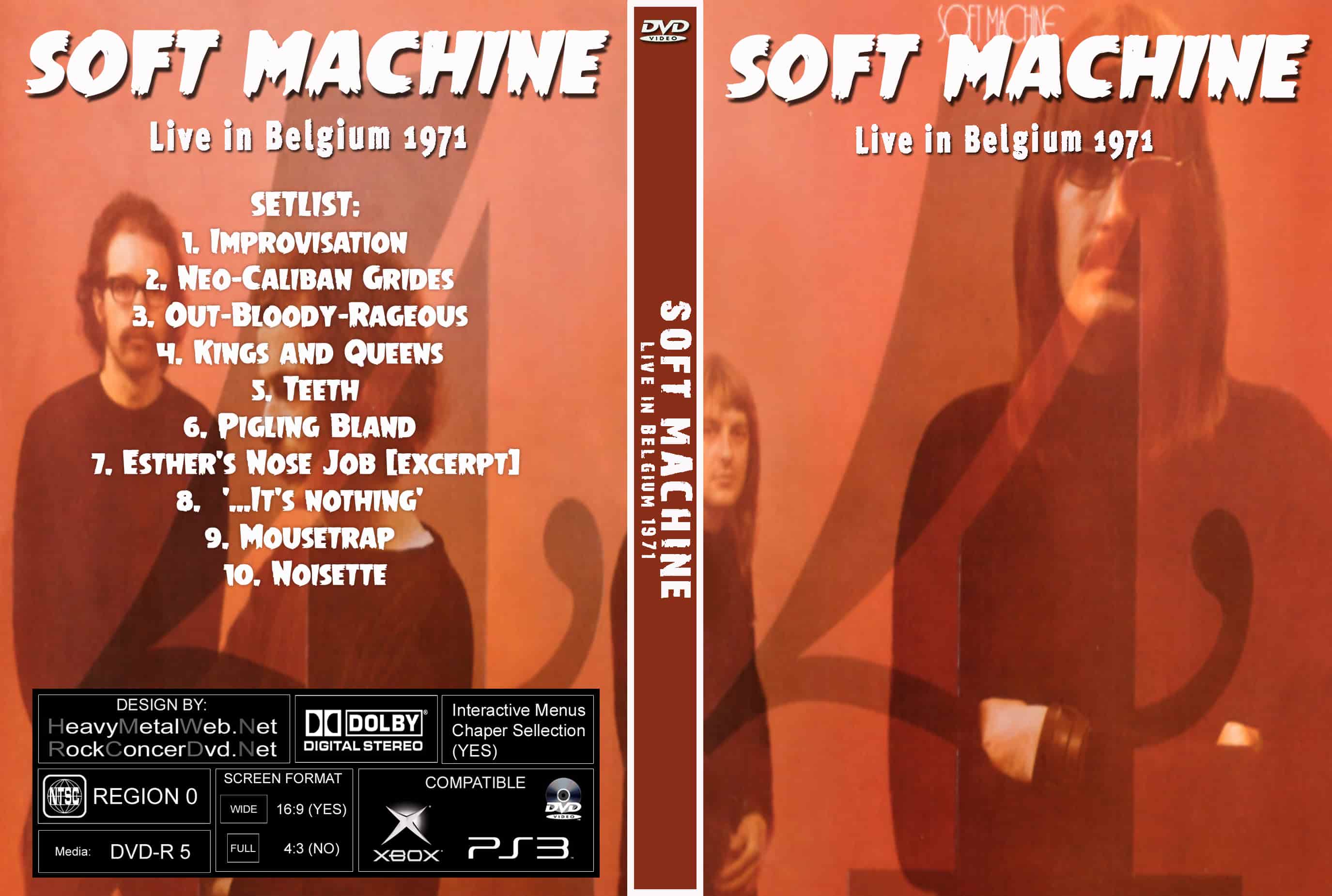 | SOFT MACHINE Live in Belgium 1971 DVD DVD Format: NTSC Source: Professional Shot (Multi- Camera) Video Quality: Rating: 8.0 Menus: Yes Chapter Selection: Every 5 Min. Full Screen: Yes HD: No Total Running Time: 63 Min. SETLIST: 1. Improvisation 2. Neo-Caliban Grides 3. Out-Bloody-Rageous 4. Kings and Queens 5. Teeth 6. Pigling Bland 7. Esther's Nose Job (excerpt) 8. '...It's nothing' 9. Mousetrap 10. Noisette |