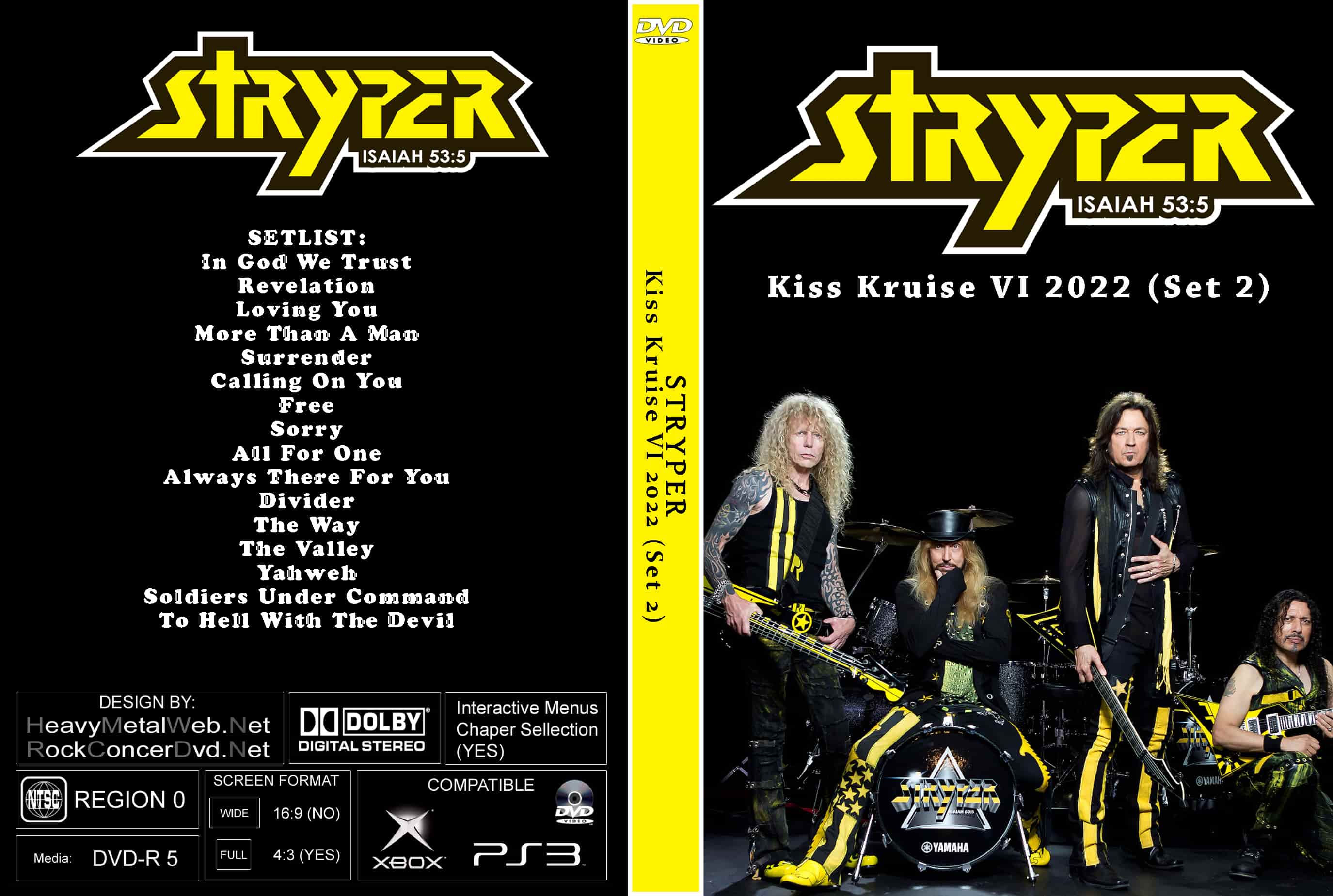 | STRYPER Kiss Kruise VI 2022 (Set 2) DVD DVD Format: NTSC Source: Audience Shot (Multi-Cam) Video Quality: Rating: 8.5 Menus: No Chapter Selection: Every 5 Min Widescreen: Yes HD: Yes Total Running Time: 77 Min. SETLIST: In God We Trust Revelation Loving You More Than A Man Surrender Calling On You Free Sorry All For One Always There For You Divider The Way The Valley Yahweh Soldiers Under Command To Hell With The Devil |