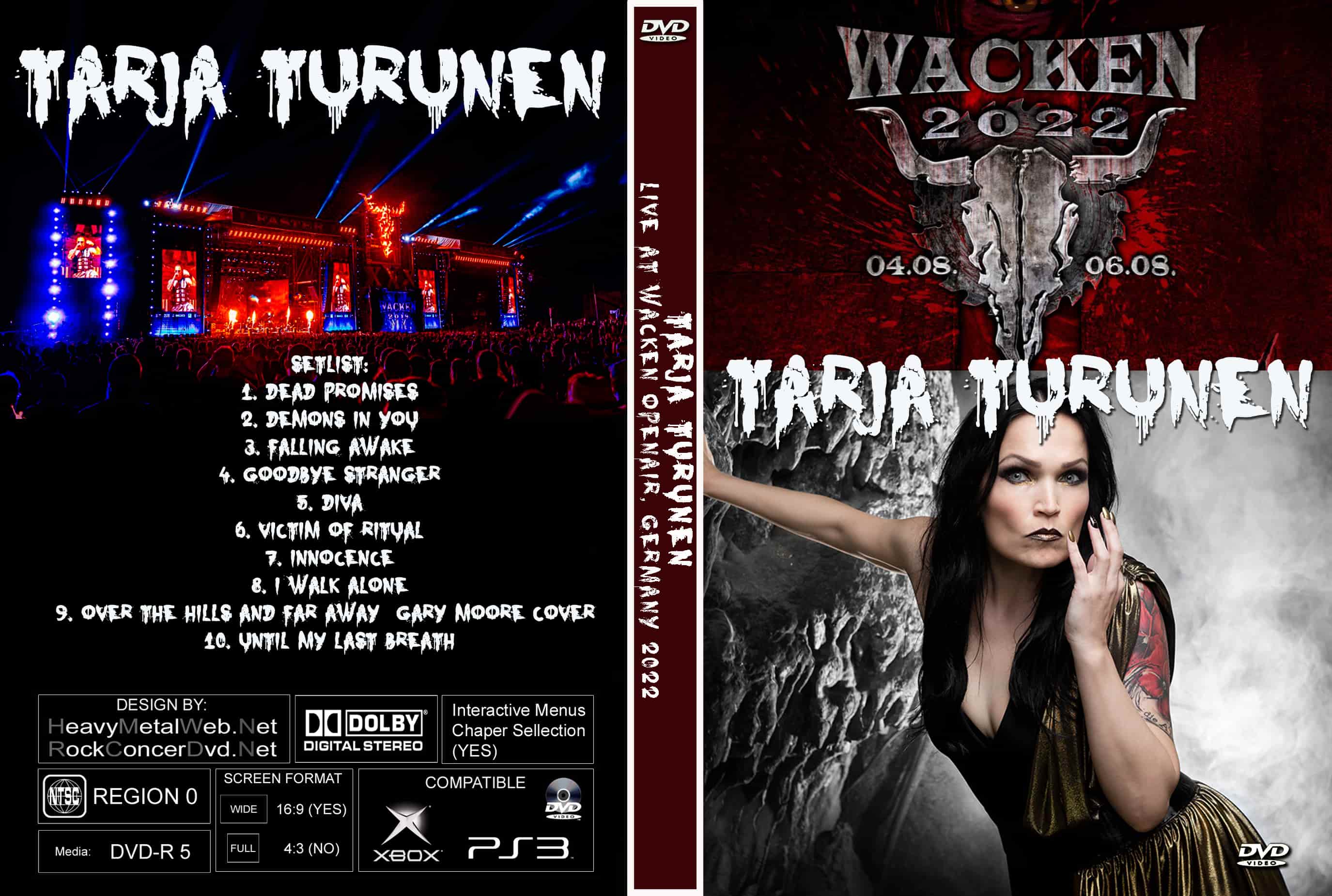 | TARJA TURUNEN Live Wacken Open Air, Germany 2022 DVD DVD Format: NTSC Source: Professional Shot (Multi Camera) Video Quality: Rating: 9.0 Menus: No Chapter Selection: Every 5 Min Widescreen: Yes HD: Yes Total Running Time: 58 Min. SETLIST: 1. Dead Promises 2. Demons in You 3. Falling Awake 4. Goodbye Stranger 5. Diva 6. Victim of Ritual 7. Innocence 8. I Walk Alone 9. Over the Hills and Far Away (Gary Moore cover) 10. Until My Last Breath |