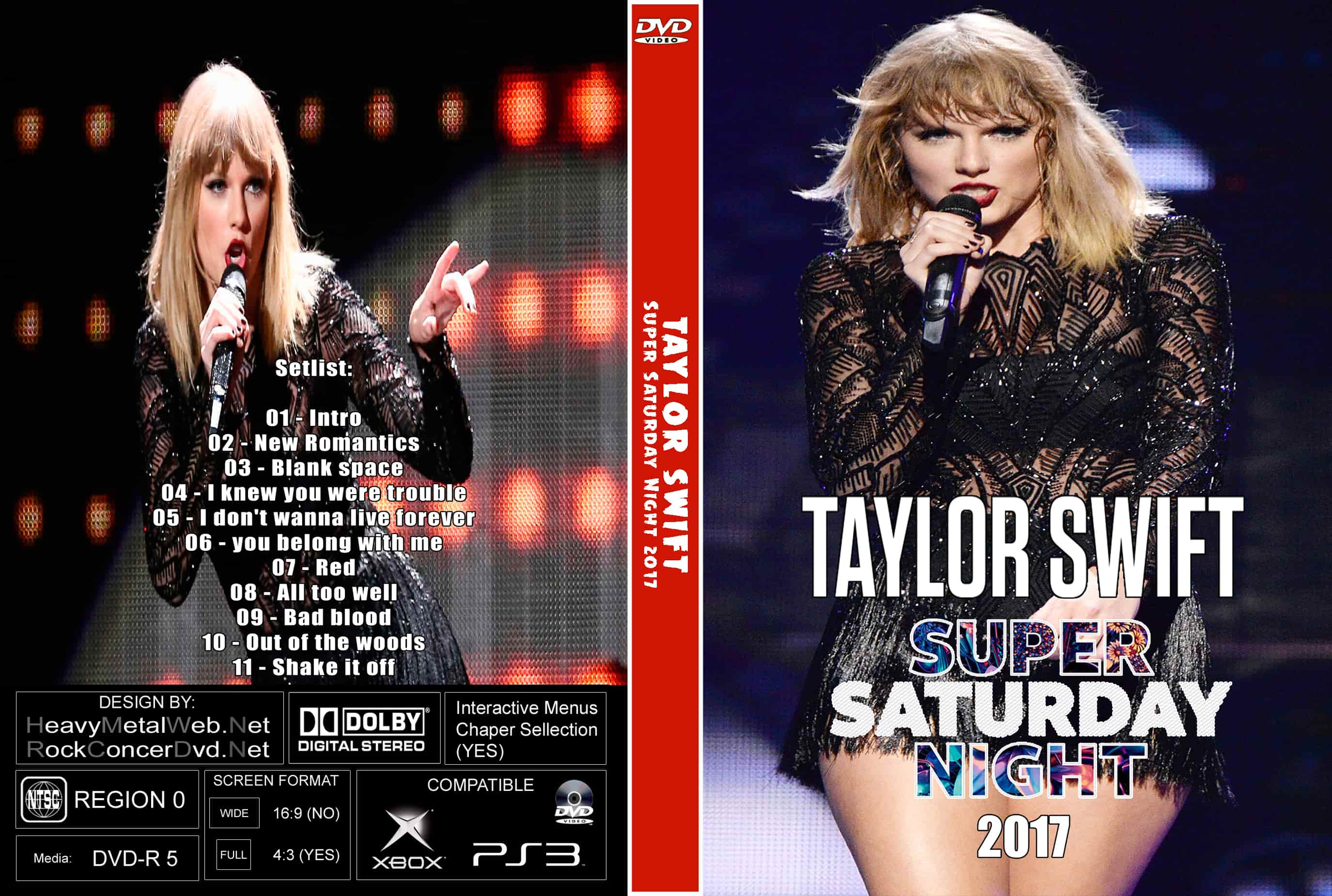 | TAYLOR SWIFT Super Saturday Night 2017 DVD DVD Format: NTSC Source: Professional Shot (Multi- Camera) Video Quality: Rating: 9.0 Menus: Yes Chapter Selection: Yes WideScreen: Yes HD: Yes Total Running Time: 53 Min. SETLIST: New Romantics Blank Space I Knew You Were Trouble I Don't Wanna Live Forever You Belong With Me Red All Too Well Bad Blood Out of the Woods Shake It Off |