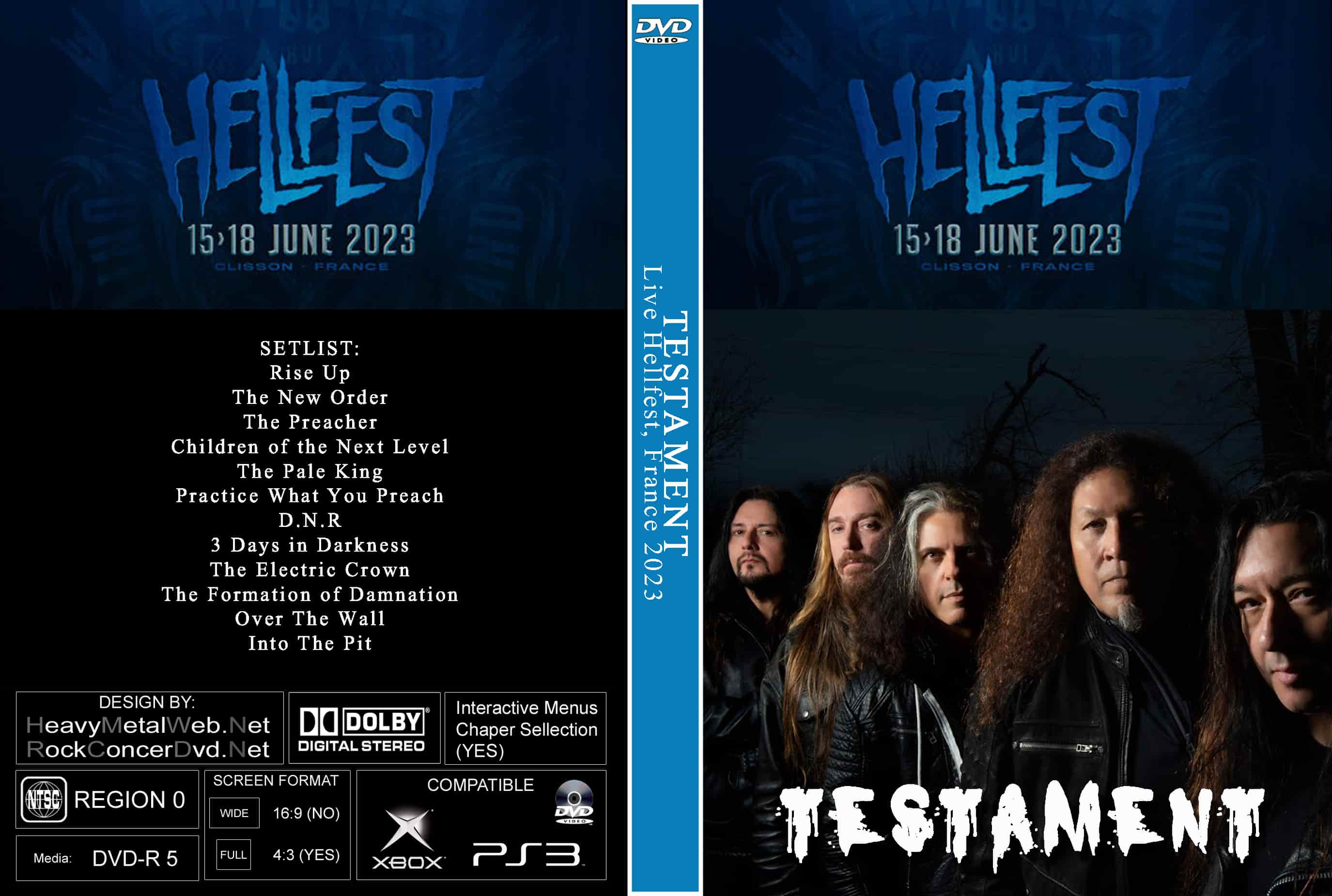 | TESTAMENT Live At The Hellfest, France 2023 DVD DVD Format: NTSC Source: Professional Shot (Multi- Camera) Video Quality: Rating: 9.0 Menus: No Chapter Selection: Skip Avery 5 Min WideScreen: Yes HD: Yes Total Running Time: 67 Min. SETLIST: Rise Up The New Order The Preacher Children of the Next Level The Pale King Practice What You Preach D.N.R 3 Days in Darkness The Electric Crown The Formation of Damnation Over The Wall Into The Pit |