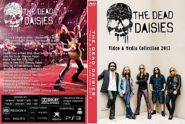 | THE DEAD DAISIES Video & Media Collection 2017 (2 DVDs) DVD Format: NTSC Source: Pro-Shot (Multi Camera) Video Quality: Rating: 9.0 Menus: No Chapter Selection: Every 5 Min. Widescreen: Yes HD: Yes Total Running Time: 74 Min. SETLIST: DVD 1 1- “Live & Louder in Japan” (Documentary) 46 Min 2- Live Acoustic Set Monkey Trap Sessions 32 min. 3- Rig Rundown Doug Aldrich and Marco Mendoza 36 Min. DVD 2 Duke TV Live in Paris 2016 (Make Some Noise - Song and a Prayer) Long Way To Go (Official Video) World Tour Mini Flick 2017 Angel In Your Eyes (Official Video) Devil Out Of Time (Official Video) iRockRadio (Acoustic) - Song and a Prayer Join Together (Official Video) 'Mainline' Live at Ramblin' Man 2016 Mexico (Official Video) Midnight Moses (Official Video) She Always Gets Her Way (All The Same) (Official Video) Washington (Official Video) Make Some Noise - LIVE & LOUDER_ (official video) |