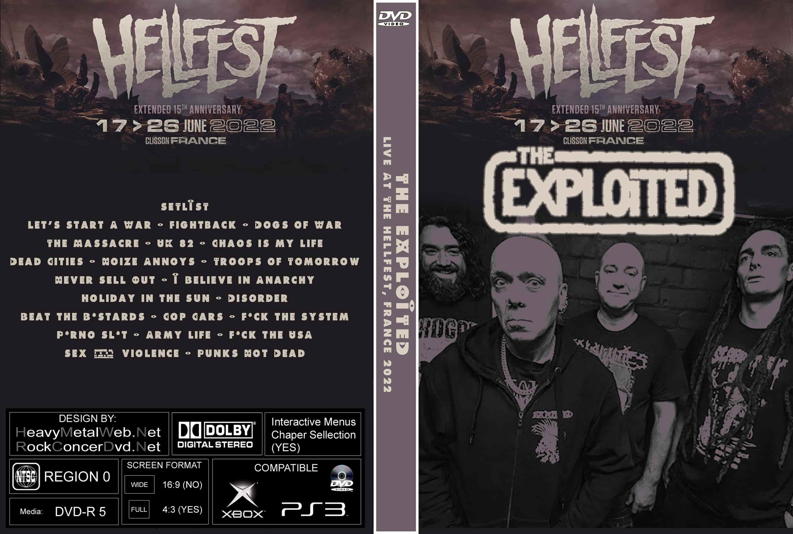 | THE EXPLOITED Live At The Hellfest 2022 DVD DVD Format: NTSC Source: Professional Shot (Multi Camera) Video Quality: Rating: 9.0 Menus: No Chapter Selection: Every 5 Min Widescreen: Yes HD: Yes Total Running Time: 65 Min. SETLIST let's Start A War Fightback Dogs of War The Massacre UK 82 Chaos is my Life Dead Cities Noize Annoys Troops of Tomorrow Never Sell Out I Believe in Anarchy Holiday in the Sun Disorder Beat the B*stards Cop Cars F*ck the System P*rno Sl*t Army Life F*ck the USA Sex & Violence Punks Not Dead |