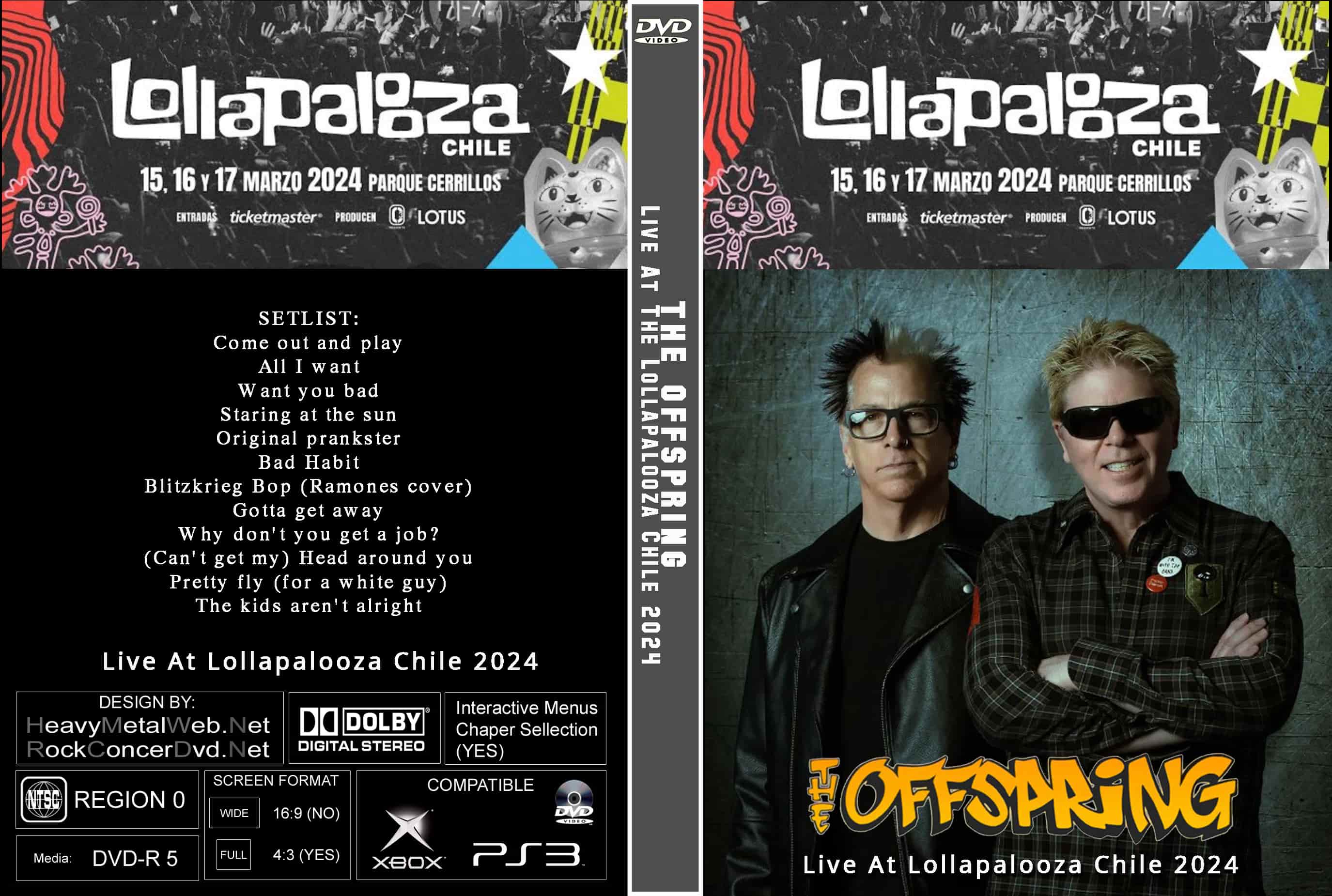 | THE OFFSPRING Live At Lollapalooza Chile 2024 DVD DVD Format: NTSC Source: Professional Shot (Multi- Camera) Video Quality: Rating: 9.0 Menus: Yes Chapter Selection: Every 5 Min WideScreen: Yes HD: Yes Total Running Time: 58 Min. SETLIST: Come out and play All I want Want you bad Staring at the sun Original prankster Bad Habit Blitzkrieg Bop (Ramones cover) Gotta get away Why don't you get a job? (Can't get my) Head around you Pretty fly (for a white guy) The kids aren't alright |