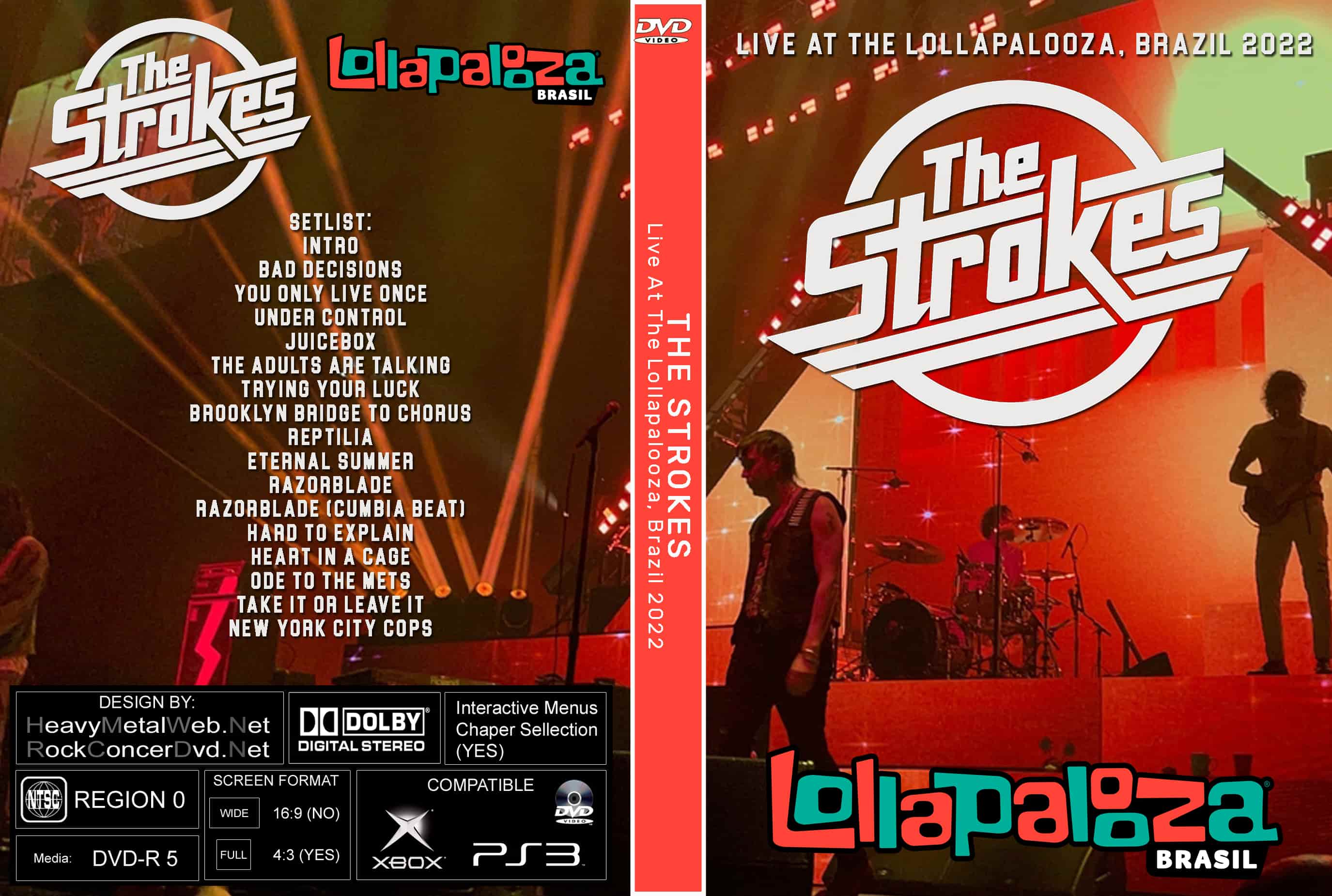 | THE STROKES Live At The Lollapalooza, Brazil 2022 DVD DVD Format: NTSC Source: Professional Shot (Multi Camera) Video Quality: Rating: 9.0 Menus: No Chapter Selection: Every 5 Min Widescreen: Yes HD: Yes Total Running Time: 75 Min. SETLIST: Intro Bad Decisions You Only Live Once Under Control Juicebox The Adults Are Talking Trying Your Luck Brooklyn Bridge to Chorus Reptilia Eternal Summer Razorblade Razorblade (Cumbia beat) Hard to Explain Heart in a Cage Ode to the Mets Take It or Leave It New York City Cops |