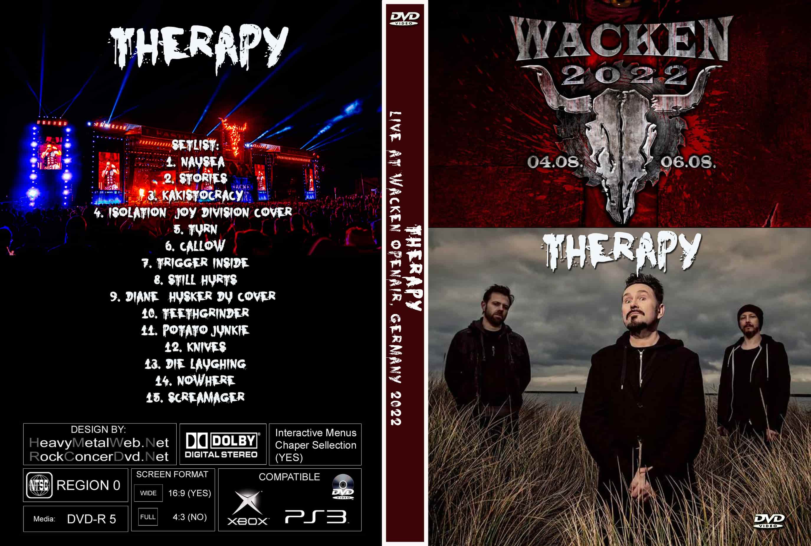 | THERAPY Live Wacken Open Air, Germany 2022 DVD DVD Format: NTSC Source: Professional Shot (Multi Camera) Video Quality: Rating: 9.0 Menus: No Chapter Selection: Every 5 Min Widescreen: Yes HD: Yes Total Running Time: 55 Min. SETLIST: 1. Nausea 2. Stories 3. Kakistocracy 4. Isolation (Joy Division cover) 5. Turn 6. Callow 7. Trigger Inside 8. Still Hurts 9. Diane (Husker Du cover) 10. Teethgrinder 11. Potato Junkie 12. Knives 13. Die Laughing 14. Nowhere 15. Screamager |