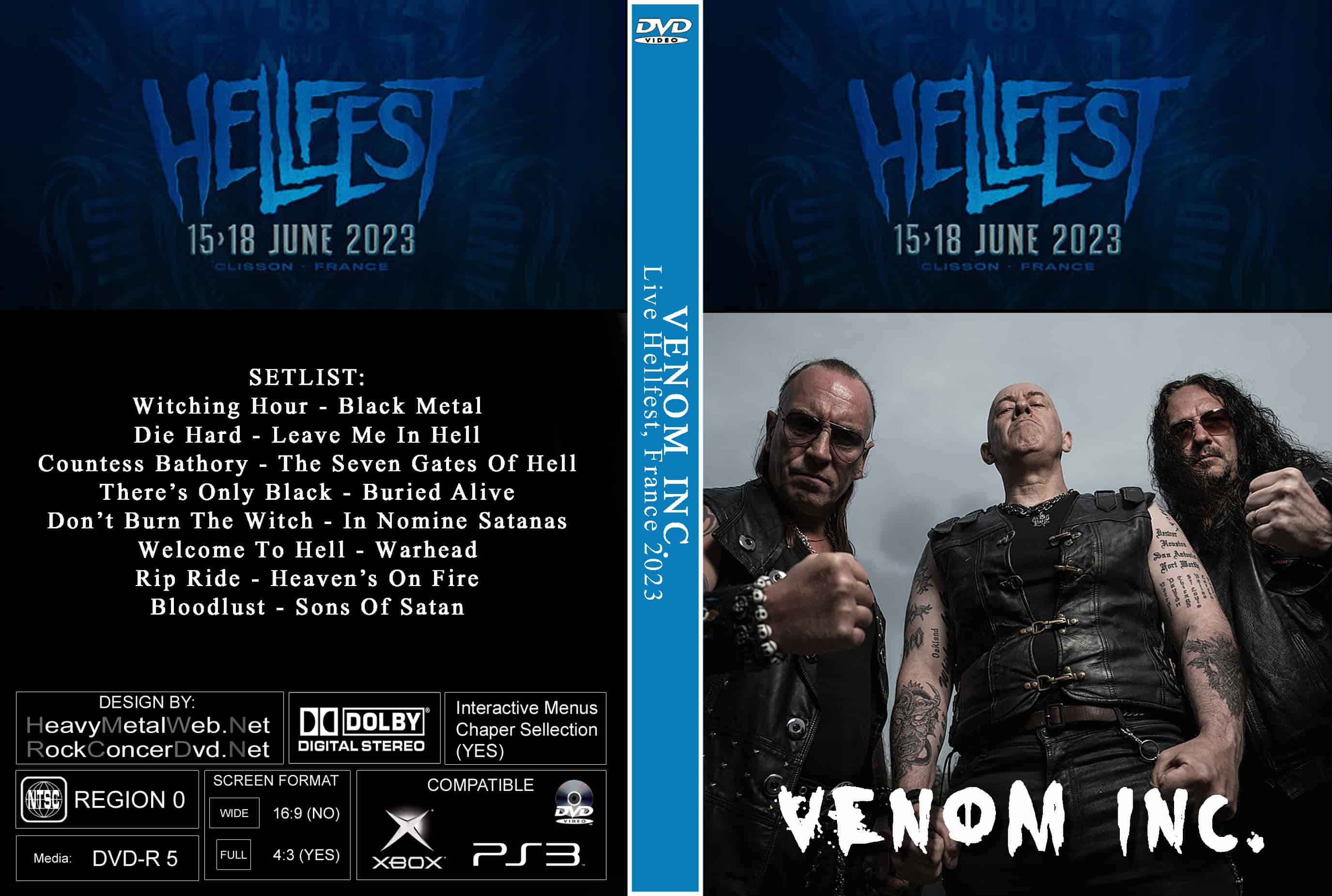 | VENOM INC. Live At The Hellfest, France 2023 DVD DVD Format: NTSC Source: Professional Shot (Multi- Camera) Video Quality: Rating: 9.0 Menus: No Chapter Selection: Skip Avery 5 Min WideScreen: Yes HD: Yes Total Running Time: 67 Min. SETLIST: Witching Hour Black Metal Die Hard Leave Me In Hell Countess Bathory The Seven Gates Of Hell There’s Only Black Buried Alive Don’t Burn The Witch In Nomine Satanas Welcome To Hell Warhead Rip Ride Heaven’s On Fire Bloodlust Sons Of Satan |