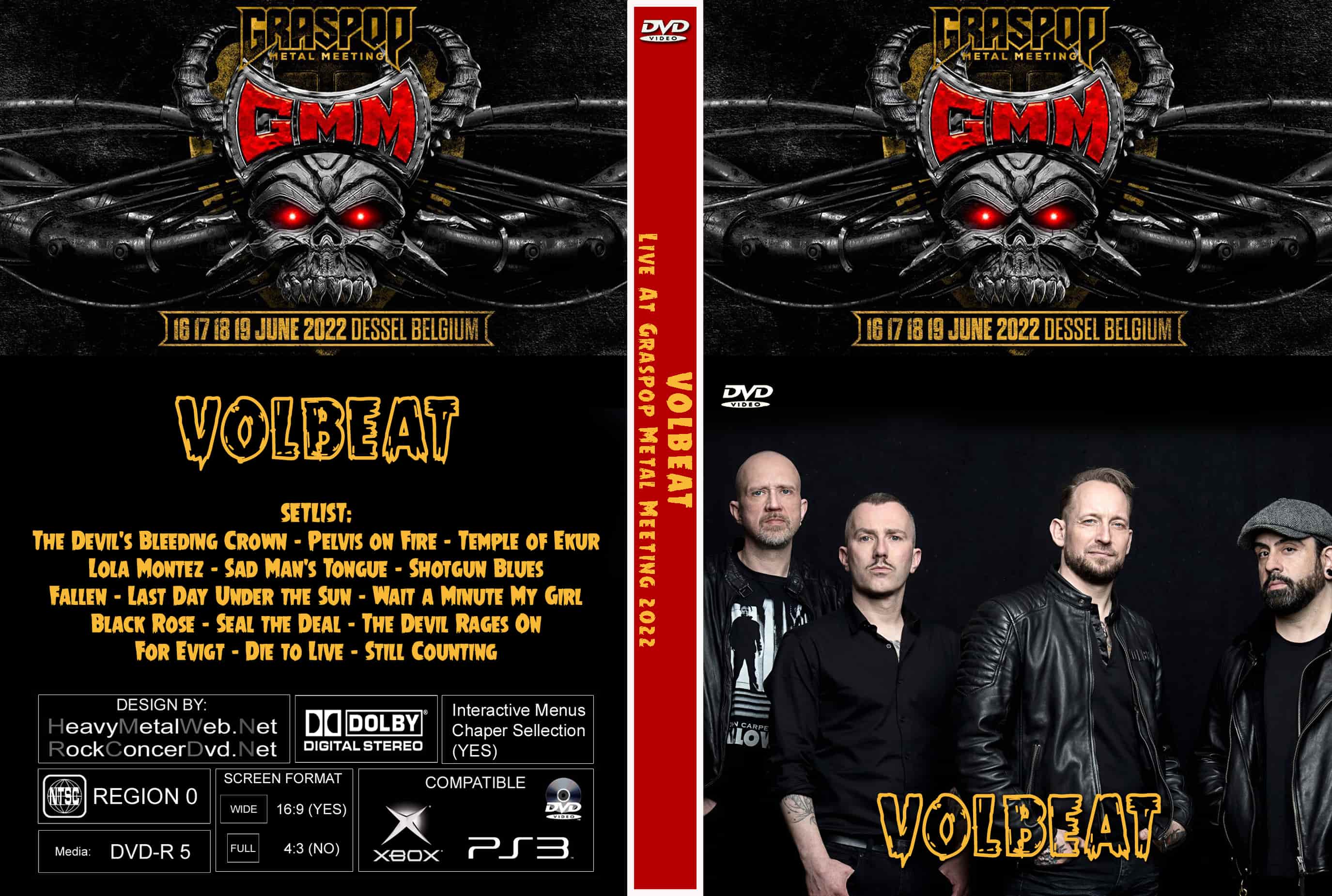 | VOLBEAT Live At Graspop Metal Meeting, Belgium 2022 DVD DVD Format: NTSC Source: Professional Shot (Multi Camera) Video Quality: Rating: 7.5 (Web Quality) Menus: No Chapter Selection: Every 5 Min Widescreen: Yes HD: No Total Running Time: 82 Min. SETLIST: The Devil's Bleeding Crown Pelvis on Fire Temple of Ekur Lola Montez Sad Man's Tongue Shotgun Blues Fallen Last Day Under the Sun Wait a Minute My Girl Black Rose Seal the Deal The Devil Rages On For Evigt Die to Live Still Counting |
