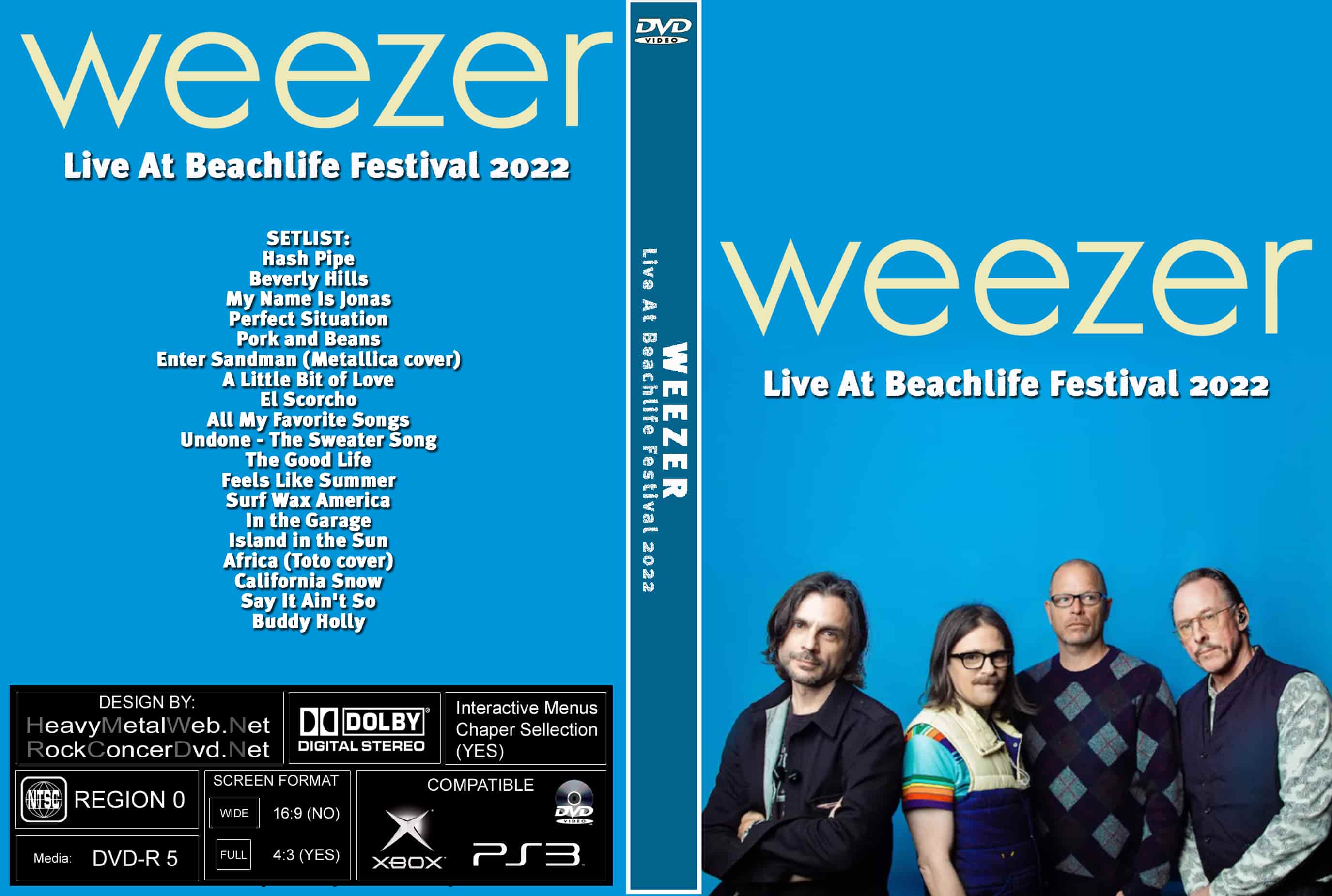 | WEEZER Live At Beachlife Festival 2022 DVD DVD Format: NTSC Source: Professional Shot (Multi Camera) Video Quality: Rating: 9.0 Menus: No Chapter Selection: Every 5 Min Widescreen: Yes HD: Yes Total Running Time: 68 Min. SETLIST: Hash Pipe Beverly Hills My Name Is Jonas Perfect Situation Pork and Beans Enter Sandman (Metallica cover) A Little Bit of Love El Scorcho All My Favorite Songs Undone - The Sweater Song The Good Life Feels Like Summer Surf Wax America In the Garage Island in the Sun Africa (Toto cover) California Snow Say It Ain't So Buddy Holly |