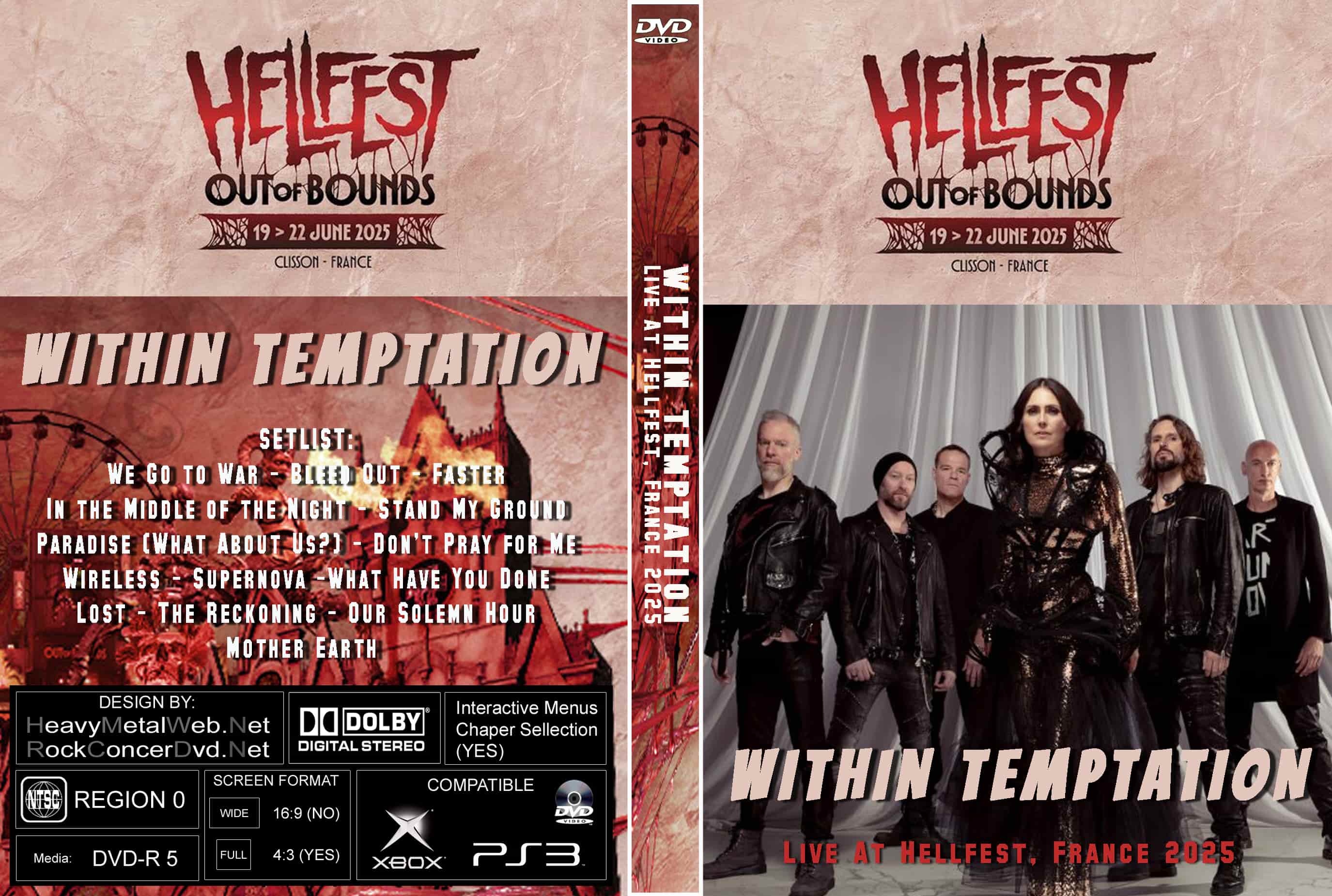 | WITHIN TEMPTATION Live At Hellfest, France 06-20-2025 DVD DVD Format: NTSC Source: Professional Shot (Multi‑Camera) Video Quality: Rating: 9.0, HD, Widescreen Menus: No Chapter Selection: Every 5 Min. Total Running Time: 72 Min SETLIST: We Go to War Bleed Out Faster In the Middle of the Night Stand My Ground Paradise (What About Us?) Don’t Pray for Me Wireless Supernova What Have You Done Lost The Reckoning Our Solemn Hour Mother Earth |