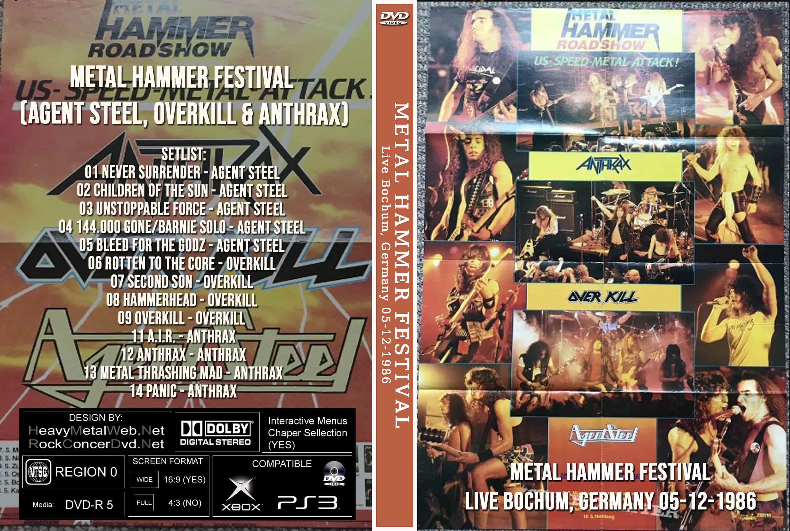 | METAL HAMMER FESTIVAL (AGENT STEEL, OVERKILL & ANTHRAX) Live Bochum, Germany 05-12-1986 DVD DVD Format: NTSC Source: Professional Shot (Multi- Camera) Video Quality: Rating: 8.0 Menus: No Chapter Selection: Every 5 Min Full Screen: Yes HD: No Total Running Time: 52 Min. SETLIST: 01 Never Surrender - Agent Steel 02 Children of the Sun - Agent Steel 03 Unstoppable Force - Agent Steel 04 144.000 Gone/Barnie Solo - Agent Steel 05 Bleed for the Godz - Agent Steel 06 Rotten to the Core - Overkill 07 Second Son - Overkill 08 Hammerhead - Overkill 09 Overkill - Overkill 11 A.I.R. - Anthrax 12 Anthrax - Anthrax 13 Metal Thrashing Mad - Anthrax 14 Panic - Anthrax |