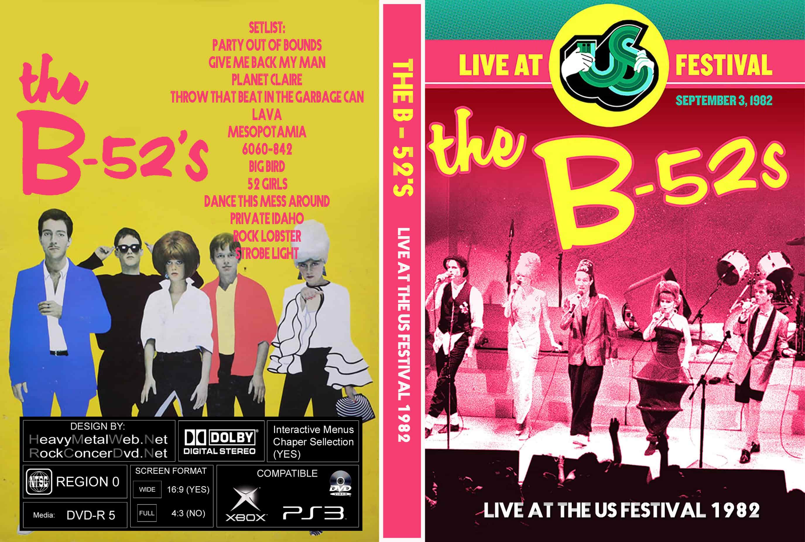 | THE B-52'S Live at The US Festival 1982 DVD DVD Format: NTSC Source: Professional Shot (Multi Camera) Video Quality: Rating: 8.0 Menus: No Chapter Selection: Every 5 Min Fullscreen: Yes HD: No Total Running Time: 106 Min. SETLIST: Party Out Of Bounds Give Me Back My Man Planet Claire Throw That Beat In The Garbage Can Lava Mesopotamia 6060-842 Big Bird 52 Girls Dance This Mess Around Private Idaho Rock Lobster Strobe Light |