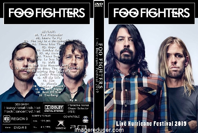 | FOO FIGHTERS Live Hurricane Festival 2019 (2 DVDs) DVD Format: NTSC Source: Pro-Shot (Multi Camera) Video Quality: Rating: 9.0 Menus: No Chapter Selection: Every 5 Min Widescreen: Yes HD: Yes Total Running Time: 124 Min. SETLIST: 01. The Pretender 02. Learn To Fly 03. The Sky Is A Neighborhood 04. Times Like These 05. Rope 06. Sunday Rain 07. My Hero 08. These Days 09. La Dee Da 10. Walk 11. Just Like Heaven (jam) 12. Another One Bites The Dust (part of) 13. Blitzkrieg Bop (part of) 14. Under Pressure 15. All My Life 16. Run 17. Wheels 18. Monkey Wrench 19. Make It Right 20. Best Of You 21. Everlong |