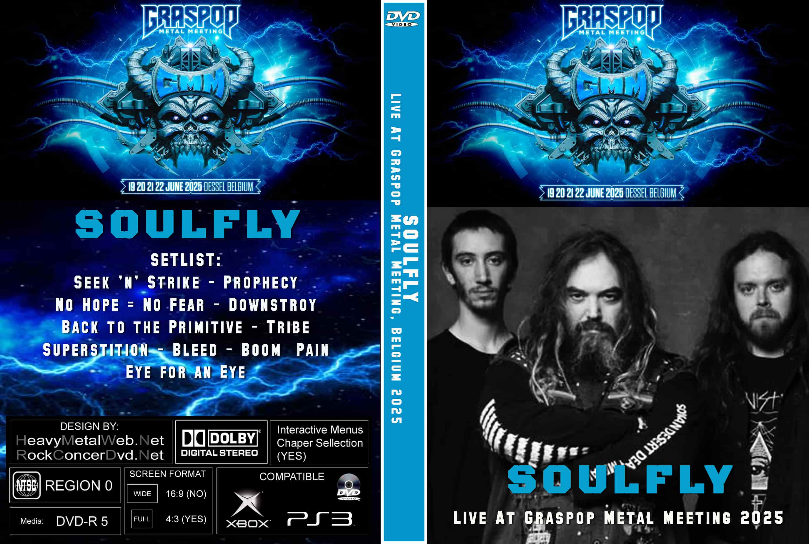 | SOULFLY Live At Graspop Metal Meeting, Belgium 06-21-2025 DVD DVD Format: NTSC Source: Professional Shot Video Quality: Rating: 9.0, HD, Widescreen Menus: No Chapter Selection: Every 5 Min. Total Running Time: 50 Min SETLIST: Seek 'n' Strike Prophecy No Hope = No Fear Downstroy Back to the Primitive Tribe Superstition Bleed Boom Pain Eye for an Eye |