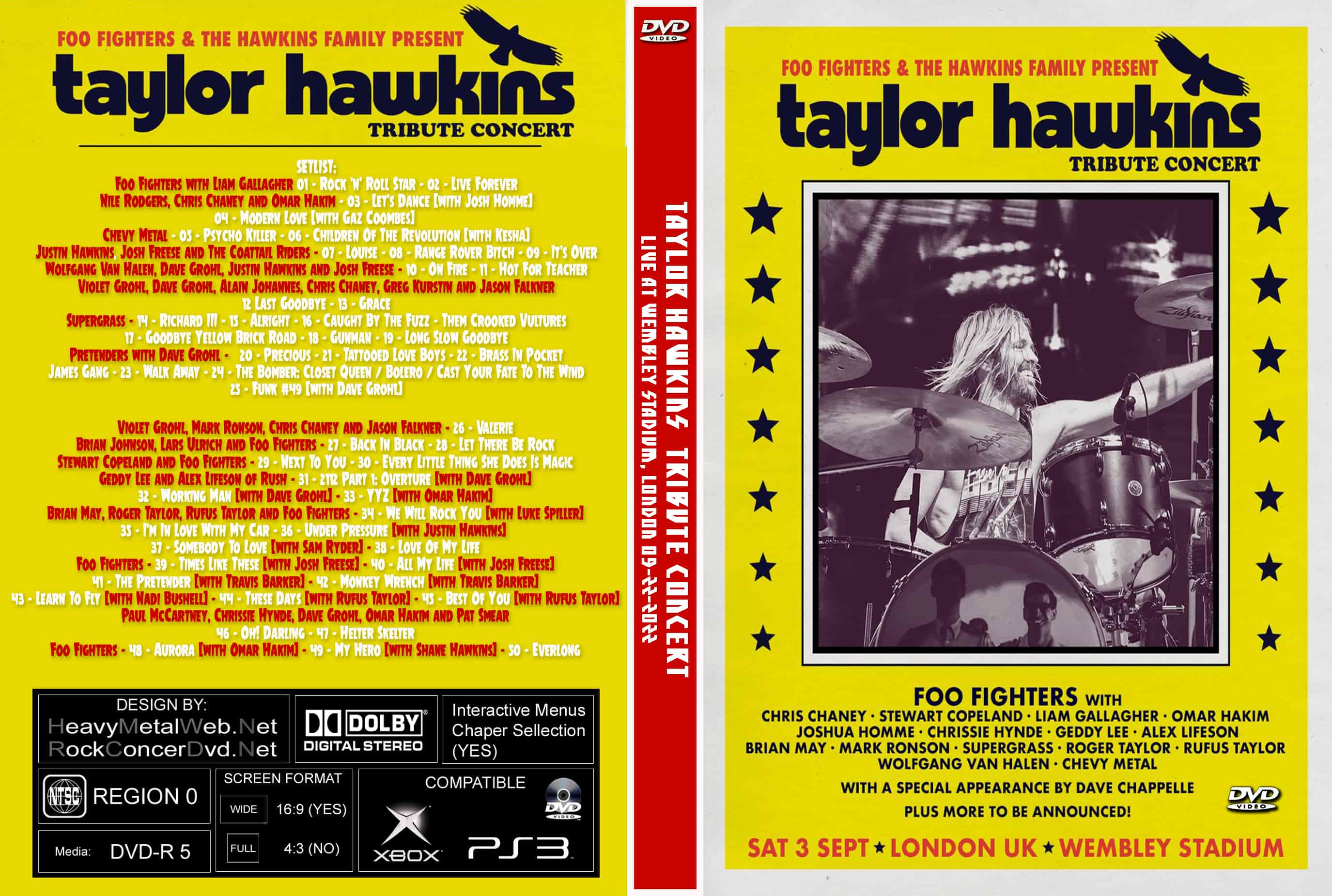 | TAYLOR HAWKINS Tribute Concert, Wembley Stadium, London 09-22-2022 (4 DVDs) DVD Format: NTSC Source: Professional Shot (Multi Camera) Video Quality: Rating: 9.0 Menus: No Chapter Selection: Every 5 Min Widescreen: Yes HD: Yes Total Running Time: 5Hrs 49Min. SETLIST: Foo Fighters with Liam Gallagher 01 - Rock 'n' Roll Star 02 - Live Forever Nile Rodgers, Chris Chaney and Omar Hakim 03 - Let's Dance (with Josh Homme) 04 - Modern Love (with Gaz Coombes) Chevy Metal 05 - Psycho Killer 06 - Children Of The Revolution (with Kesha) Justin Hawkins, Josh Freese and The Coattail Riders 07 - Louise 08 - Range Rover Bitch 09 - It's Over Wolfgang Van Halen, Dave Grohl, Justin Hawkins and Josh Freese 10 - On Fire 11 - Hot For Teacher Violet Grohl, Dave Grohl, Alain Johannes, Chris Chaney, Greg Kurstin and Jason Falkner 12 Last Goodbye 13 - Grace Supergrass 14 - Richard III 15 - Alright 16 - Caught By The Fuzz Them Crooked Vultures 17 - Goodbye Yellow Brick Road 18 - Gunman 19 - Long Slow Goodbye Pretenders with Dave Grohl 20 - Precious 21 - Tattooed Love Boys 22 - Brass In Pocket James Gang 23 - Walk Away 24 - The Bomber: Closet Queen / Bolero / Cast Your Fate To The Wind 25 - Funk #49 (with Dave Grohl) Violet Grohl, Mark Ronson, Chris Chaney and Jason Falkner 26 - Valerie Brian Johnson, Lars Ulrich and Foo Fighters 27 - Back In Black 28 - Let There Be Rock Stewart Copeland and Foo Fighters 29 - Next To You 30 - Every Little Thing She Does Is Magic Geddy Lee and Alex Lifeson of Rush 31 - 2112 Part 1: Overture (with Dave Grohl) 32 - Working Man (with Dave Grohl) 33 - YYZ (with Omar Hakim) Brian May, Roger Taylor, Rufus Taylor and Foo Fighters 34 - We Will Rock You (with Luke Spiller) 35 - I'm In Love With My Car 36 - Under Pressure (with Justin Hawkins) 37 - Somebody To Love (with Sam Ryder) 38 - Love Of My Life Foo Fighters 39 - Times Like These (with Josh Freese) 40 - All My Life (with Josh Freese) 41 - The Pretender (with Travis Barker) 42 - Monkey Wrench (with Travis Barker) 43 - Learn To Fly (with Nadi Bushell) 44 - These Days (with Rufus Taylor) 45 - Best Of You (with Rufus Taylor) Paul McCartney, Chrissie Hynde, Dave Grohl, Omar Hakim and Pat Smear 46 - Oh! Darling 47 - Helter Skelter Foo Fighters 48 - Aurora (with Omar Hakim) 49 - My Hero (with Shane Hawkins) 50 - Everlong |