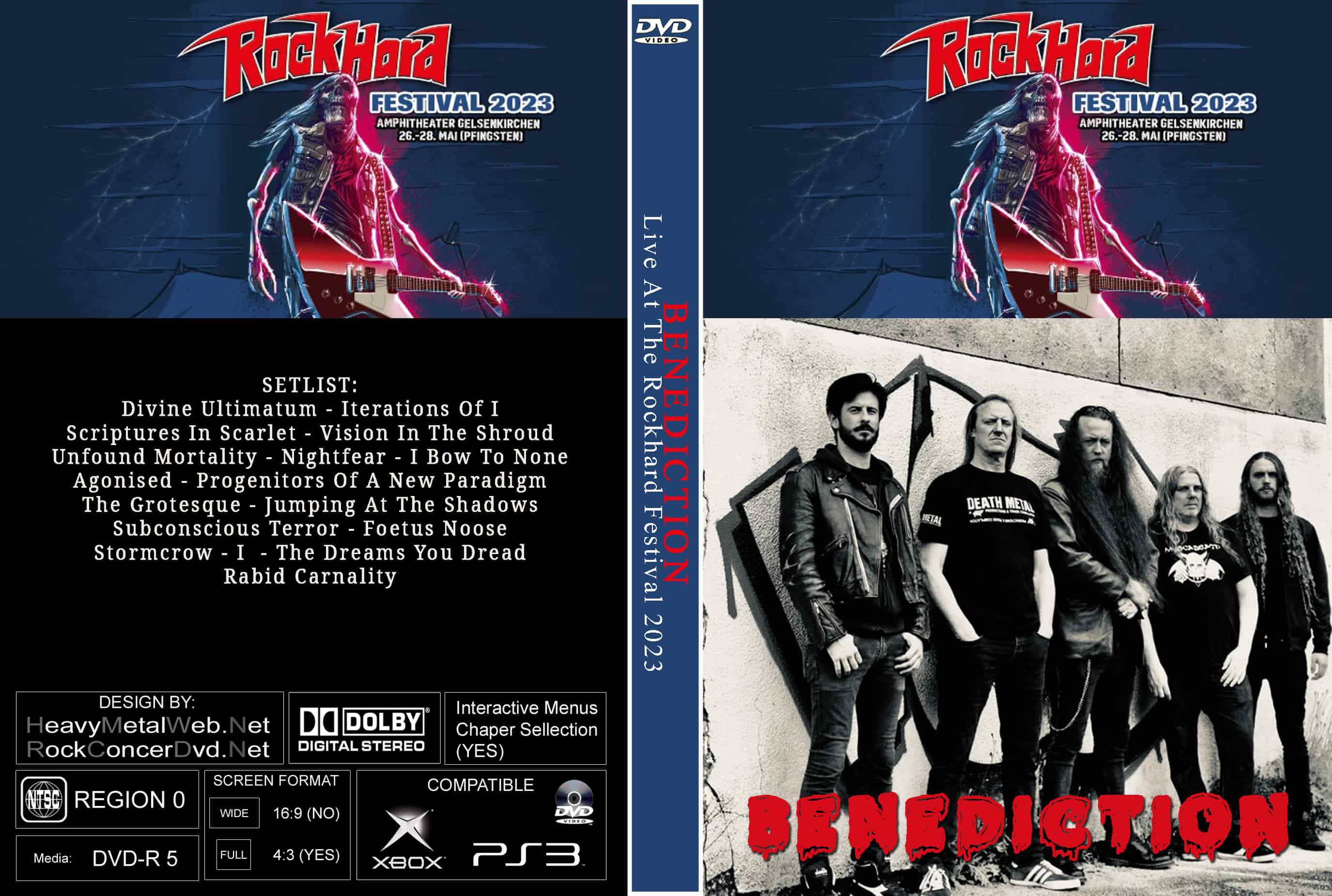 | BENEDICTION Live At The Rock Hard Festival 2023 DVD DVD Format: NTSC Source: Professional Shot (Multi- Camera) Video Quality: Rating: 9.0 Menus: Skip Every 5 Min Chapter No WideScreen: Yes HD: Yes Total Running Time: 68 Min. SETLIST: Divine Ultimatum Iterations Of I Scriptures In Scarlet Vision In The Shroud Unfound Mortality Nightfear I Bow To None Agonised Progenitors Of A New Paradigm The Grotesque Jumping At The Shadows Subconscious Terror Foetus Noose Stormcrow I The Dreams You Dread Rabid Carnality |
