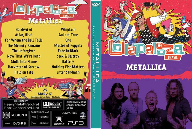 | METALLICA Live Lollapalooza Brazil, Sao Paulo, Brazil 03-25-2017 (2 DVDs) DVD Format: NTSC Source: Pro-Shot (Multi Camera) Video Quality: Rating: 9.0 Menus: No Chapter Selection: Every Song Widescreen: Yes HD: Yes Total Running Time: 138 Min. SETLIST: Hardwired Atlas, Rise! For Whom the Bell Tolls The Memory Remains The Unforgiven Now That We’re Dead Moth Into Flame Harvester of Sorrow Halo on Fire Whiplash Sad but True One Master of Puppets Fade to Black Seek & Destroy Battery Nothing Else Matters Enter Sandman |