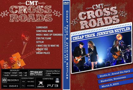 | CHEAP TRICK & JENNIFER NETTLES CMT Crossroads 2016 DVD DVD Format: NTSC Source: Professional-Shot (Multi Camera) Video Quality: Rating: 9.0 Menus: Yes Chapter Sellection: Yes Widescreen: Yes HD: Yes Total Running Time: 41 min Setlist: 01 Surrender 02 chat 03 Something More 04 chat 05 When I Wake Up Tomorrow 06 chat 07 Stay/The Flame 08 chat 09 Settlin’ 10 chat 11 I Want You To Want Me 12 chat 13 Unlove You 14 chat 15 Dream Police |