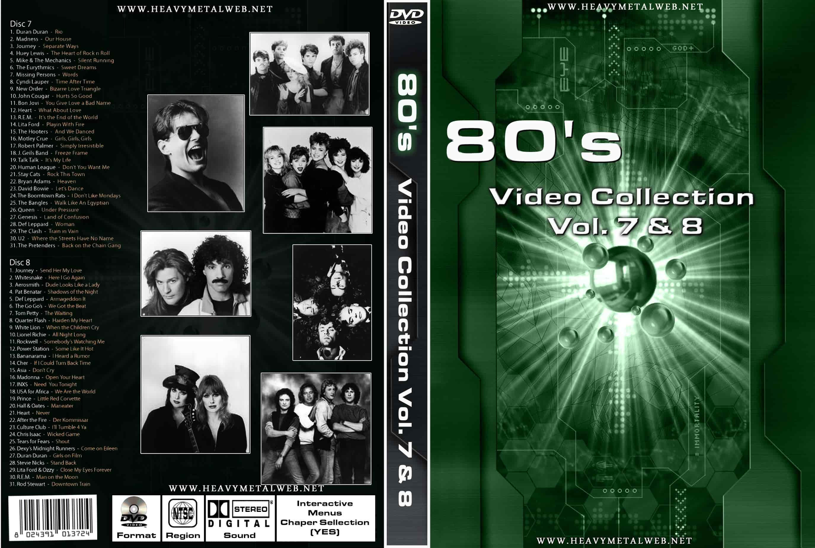 | 80's Video Collection Vol. 7 & 8 DVDs) 62 Tracks With The Best 80s Videos DVD Format: NTSC Source: Professionla-Shot (Multi-Camera) Video Quality: Rating: 9.0 Menus: Yes Chapter Selection: Yes HD: No TRACKLIST: DVD 7 1. Duran Duran - Rio 2. Madness - Our House 3. Journey - Separate Ways 4. Huey Lewis - The Heart of Rock n' Roll 5. Mike & The Mechanics - Silent Running 6. The Eurythmics - Sweet Dreams 7. Missing Persons - Words 8. Cyndi Lauper - Time After TIme 9. New Order - Bizarre Love Triangle 10. John Cougar - Hurts So Good 11. Bon Jovi - You Give Love a Bad name 12. Heart - What About Love 13. R.E.M. - It's the End of the World 14. Lita Ford - Playin' With Fire 15. The Hooters - And We Danced 16. Motley Crue - Girls, Girls, Girls 17. Robert Palmer - Simply Irresistible 18. J.Geils Band - Freeze Fram 19. Talk Talk - it's My Life 20. Human League - Don't You Want Me 21. Stray Cats - Rock This Town 22. Bryan Adams - Heaven 23. David Bowie - Let's Dance 24. The Boomtown Rats - I Don't Like Mondays 25. The Bangles - Walk Like an Egyptian 26. Queen - Under Pressure 27. Genesis - Land of Confusion 28. Def Leppard - Woman 29. The Clash - Train in Vain 30. U2 - Where the Streets Have No Name 31. The Pretenders - Back on the Chain Gang DVD 8 1. Journey - Send Her My Love 2. Whitesnake - Here I Go Again 3. Aerosmith - Dude Looks Like a Lady 4. Pat Benatar - Shadows of the Night 5. Def Leppard - Armageddon It 6. The Go Go's - We Got the Beat 7. Tom Petty - The Waiting 8. Quarter Flash - Harden My Heart 9. White Lion - When the Children Cry 10. Lionel Richie - All Night Long 11. Rockwell - Somebody's Watching Me 12. Power Station - Some Like It Hot 13. Bananarama - I Heard a Rumor 14. Cher - If I Could Turn Back Time 15. Asia - Don't Cry 16. Madonna - Open Your Heart 17. INXS - need You tonight 18. USA for Africa - We Are the World 19. Prince - Little red Corvette 20. Hall & Oates - Maneater 21. Heart - Never 22. After the Fire - Der Kommissar 23. Culture Club - I'll Tumble 4 Ya 24. Chris Isaac - Wicked Game 25. Tears For Fears - Shout 26. Dexy's Midnight Runners - Come on Eileen 27. Duran Duran - Girls on Film 28. Stevie Nicks - Stand Back 29. Lita Ford & ozzy - Close My Eyes Forever 30. R.E.M. - Man on the Moon 31. Rod Stewart - Downtown Train |