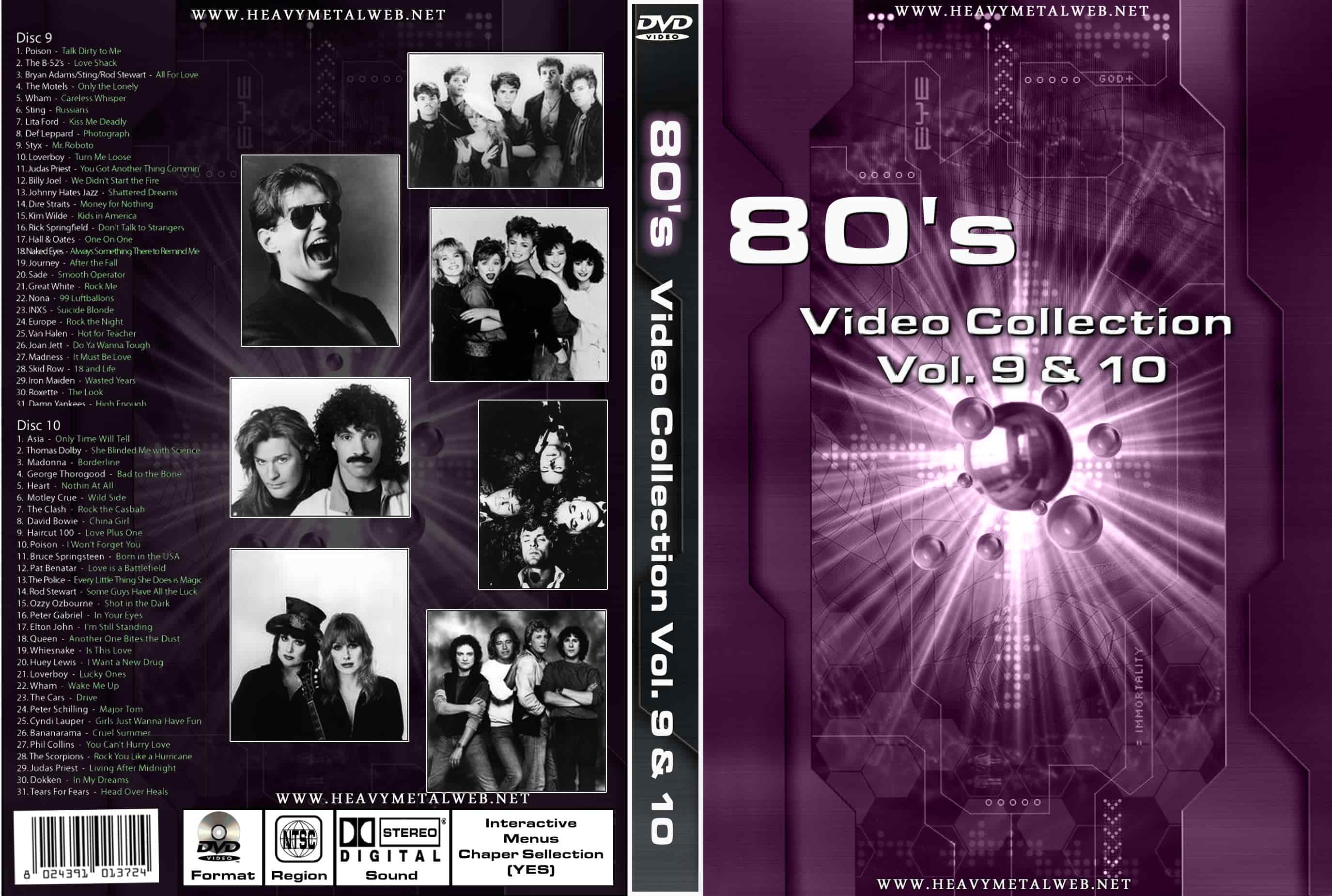| 80's Video Collection Vol. 9 & 10 DVDs) 62 Tracks With The Best 80s Videos DVD Format: NTSC Source: Professionla-Shot (Multi-Camera) Video Quality: Rating: 9.0 Menus: Yes Chapter Selection: Yes HD: No TRACKLIST: DVD 9 1. Poison - Talk Dirty to Me 2. The B-52's - Love Shack 3. Bryand Adams/Sting/Rod Stewart - All For Love 4. The Motels - Only the Lonely 5. Wham - Careless Whisper 6. Sting - Russians 7. Lita Ford - Kiss Me Deadly 8. Def Leppard - Photograph 9. Styx - Mr. Roboto 10. Loverboy - Turn Me Loose 11. Judas Priest - You Got Another Thing Commin' 12. Billy Joel - We Didn't Start the Fire 13. Johnny Hates Jazz - Shattered Dreams 14. Dire Straits - Money for Nothing 15. Kim Wilde - Kids in America 16. Rick Springfield - Don't Talk to Strangers 17. Hall & Oates - One on One 18. Naked Eyes - Always Something There to Remind Me 19. Journey - After the Fall 20. Sade - Smooth Operator 21. Great White - Rock Me 22. Nona - 99 Luftballoons 23. INXS - Suicide Blonde 24. Europe - Rock the Night 25. Van Halen - Hot for Teacher 26. Joan Jett - Do Ya Wanna Tough 27. Madness - It Must Be Love 28. Skid row - 18 and Life 29. Iron Maiden - Wasted Years 30. Roxette - The Look 31. Damn Yankees - High Enough DVD 10 1. Asia - Only Time Will Tell 2. Thomas Dolby - She Blinded Me with Science 3. Madonna - Borderline 4. georde Thorogood - Bad to the Bone 5. Heart - Nothin' At All 6. Motley Crue - Wilde Side 7. The Clash - Rock the Casbah 8. David Bowie - China Girl 9. Haircut 100 - Love Plus One 10. Poison - I Won't Forget You 11. Bruce Springsteen - Born in the USA 12. Pat Benatar - Love is a Battlefield 13. The Police - Every Little Thing She Does is Magic 14. Rod Stewart - Some Guys Have All the Luck 15. Ozzy Osbourne - Shot in the Dark 16. Peter Gabriel - In Your Eyes 17. Elton John - I'm Still Standing 18. Queen - Another One Bites the Dust 19. Whitesnake - Is This Love 20. Huey Lewis - I Want a New Drug 21. Loverboy - Lucky Ones 22. Wham - Wake Me Up 23. The Cars - Drive 24. Peter Schilling - Major Tom 25. Cyndi Lauper - Girls Just Wanna Have Fun 26. Bananarama - Cruel Summer 27. Phil Collins - You Can't hurry Love 28. The Scorpions - Rock You Like a Hurricane 29. Judas Priest - Living After Midnight 30. Dokken - In My Dreams 31. Tears For Fears - Head Over Heels |